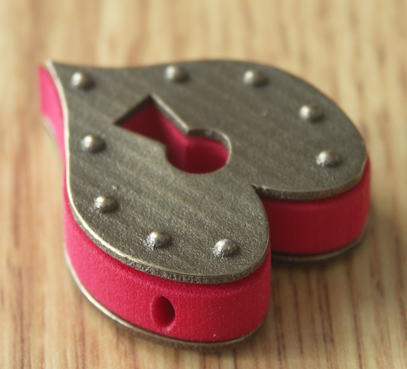 I created this using two different materials; red acrylic and antique bronze plated stainless steel. The keyhole shape goes through the pendant and there is a hole for a thin chain that goes all the way through the acrylic part. This is not available to buy from Shapeways only from me here, or possibly later, on Etsy. It is quite large but not overly heavy. I’m selling this unique pendant for $60 (CDN and US $)including shipping. If you have any questions please contact me.