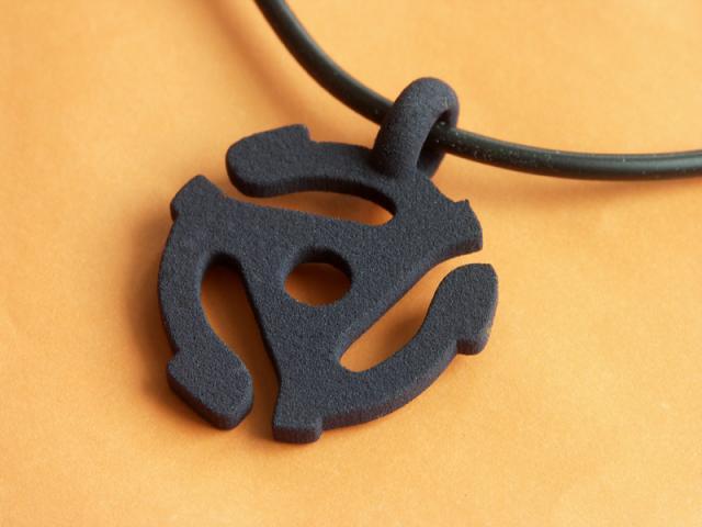 45 RPM Record Spindle Pendant for the TRUE music lover. Anyone who saw the image without reading this and didn’t know what the heck it was just HAS to be under 30 years of age! If you STILL don’t know what it is back in the days of REAL music, when a SINGLE song release was just that – ONE song on a piece of vinyl there was a large hole in the middle which allowed you to play it alone on your RECORD PLAYER, but if you wanted to stack a number of records to play following each other, then they needed to be placed on a thin spindle and thus this little piece of plastic had to be inserted to close the large hole to make the small hole available for the spindle.