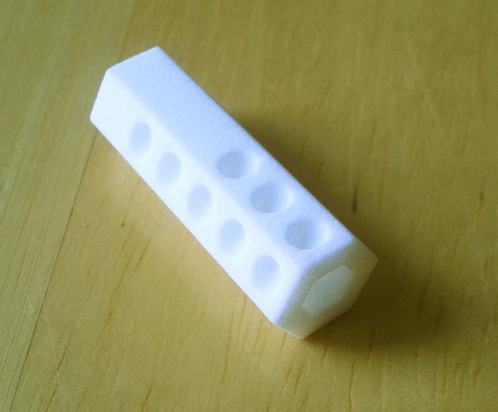 $5.96 in White, Strong and Flexible material from Shapeways: The one below is Polished WSF material which has a slightly more, well, polished appearance!