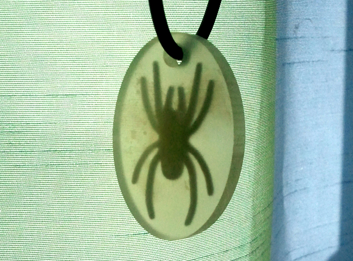 The “spider” is in fact trapped material from the manufacturing process, and the back and front of this pendant are entirely flat.