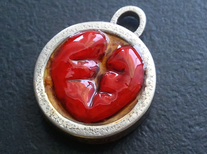 A 3D stainless steel pendant was used as the base for this design in which I also used polymer clay to form a broken heart. Pendant is 2cms in diameter and about 4mm thick.