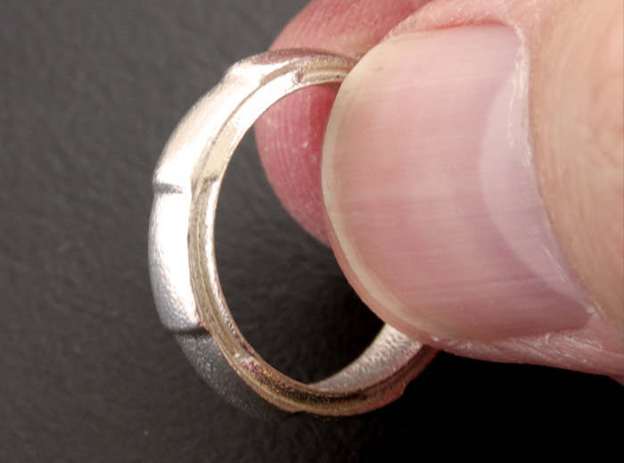 I designed this sterling silver (.925 silver) ring myself based loosely on the idea it was to resemble a part of some alien mechanical device. I say loosely because, quite honestly, whatever it looks like depends on the viewer! Either way it’s a unique design and sure to be a conversation piece. Take a close look at the ribbed incisions on the edge of the ring.