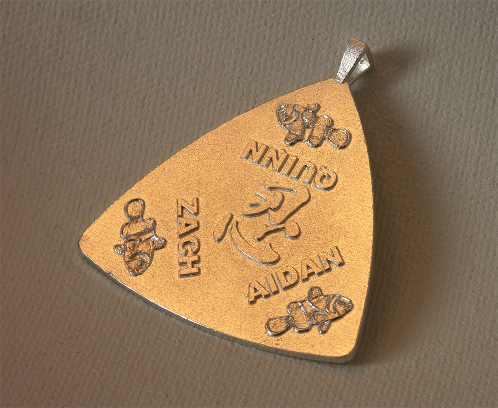 Client requested his son’s names on a Nemo themed pendant with a Japanese Kanji character on the reverse. This was to also have an aged appearance.