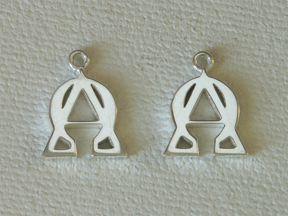 A small set of sterling silver earrings with the Alpha Omega characters combined.