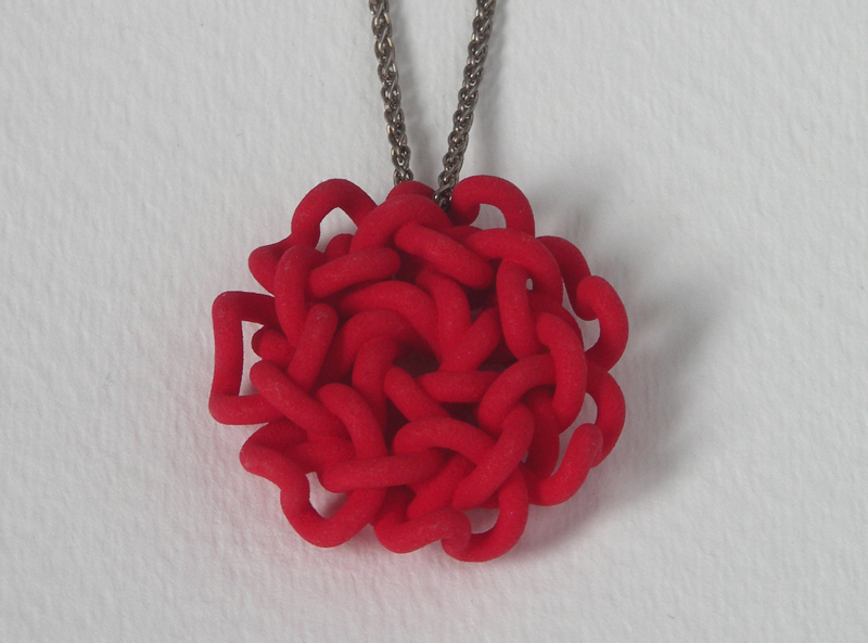 I created this pendant out of a flexible acrylic that was 3D Printed. The design is such that when you hold it in your hands you can feel all the different “strands” move since none are connected to each other. Not possible to make in metal this was my only choice of material. Shown here in red and blue but available in many other colours and in white that you can dye yourself using fabric dyes.