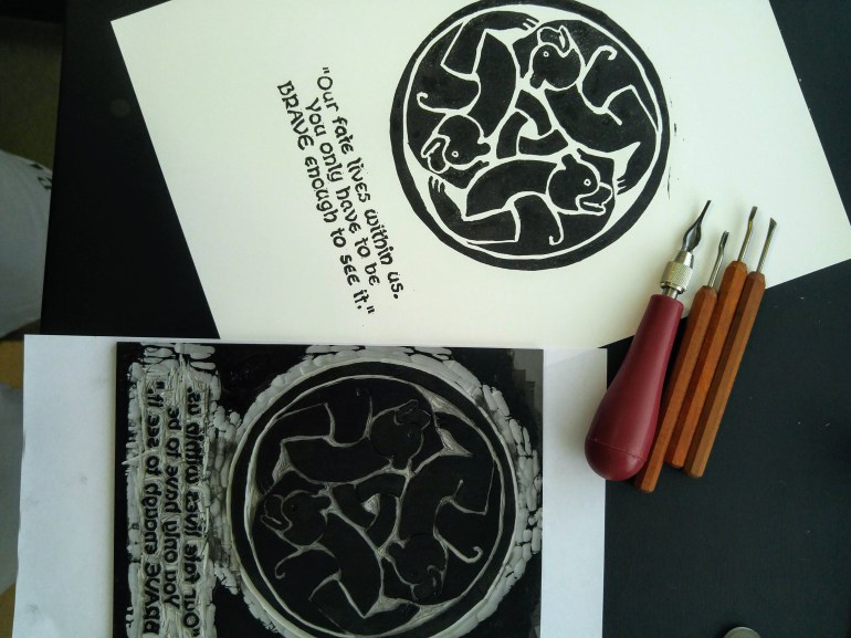 This linocut marked my getting re-acquainted with linocut printmaking again and was the first in 2018. It is a representation of the pendant worn by Merida whose three brothers get turned into bears in the Disney movie, “Brave”. The quote is also from the movie. It is signed and dated in pencil underneath the image.
