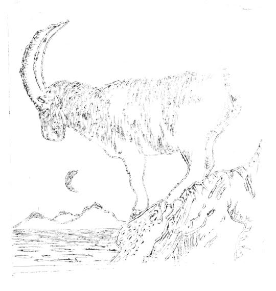 This is an open edition linocut. It depicts an Alpine Ibex doing what they do best – climbing up and down impossible mountainsides! Signed and dated in pencil.