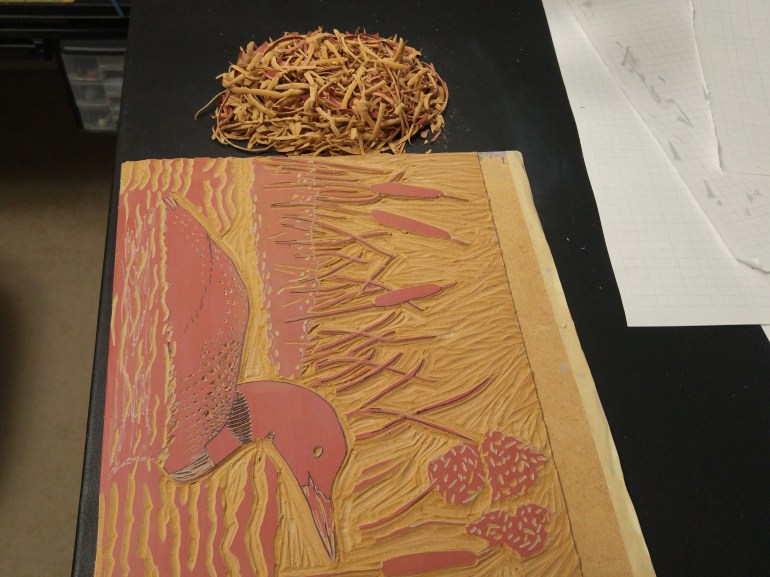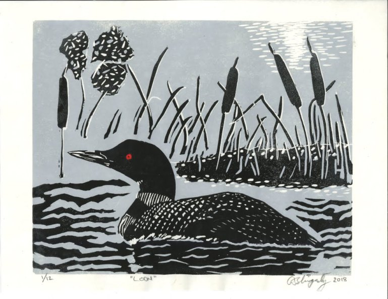 This is a limited edition print – 1 of 12 only, plus two Artist’s Proofs and some black ink only prints. Due to the reductive process no more prints can be made. The image is of a Loon in a peaceful lake setting. It is signed and dated in pencil by me underneath the image.