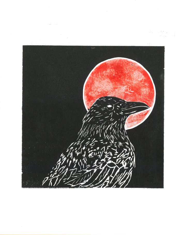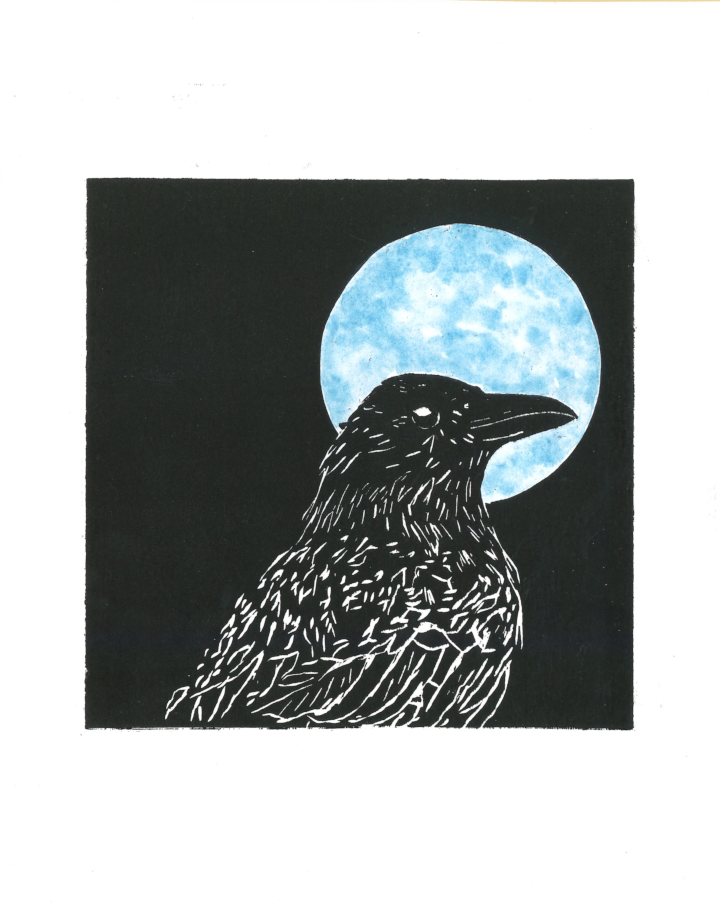 I completed three variations of this print with just a handful of each. The first one came about as a result of not being able to clean off the fixative and india ink I used for the design. This resulted in a patchy inking which I thought looked like clouds. With each successive print the effect wore off slightly, so only four exist, all a bit different. I then went on to create variations with a coloured moon. The red one was a reductive ink print, and the blue was hand painted with shimmering watercolour (light reflects at different angles as paper is tilted). US$25 each in my Etsy store HERE.