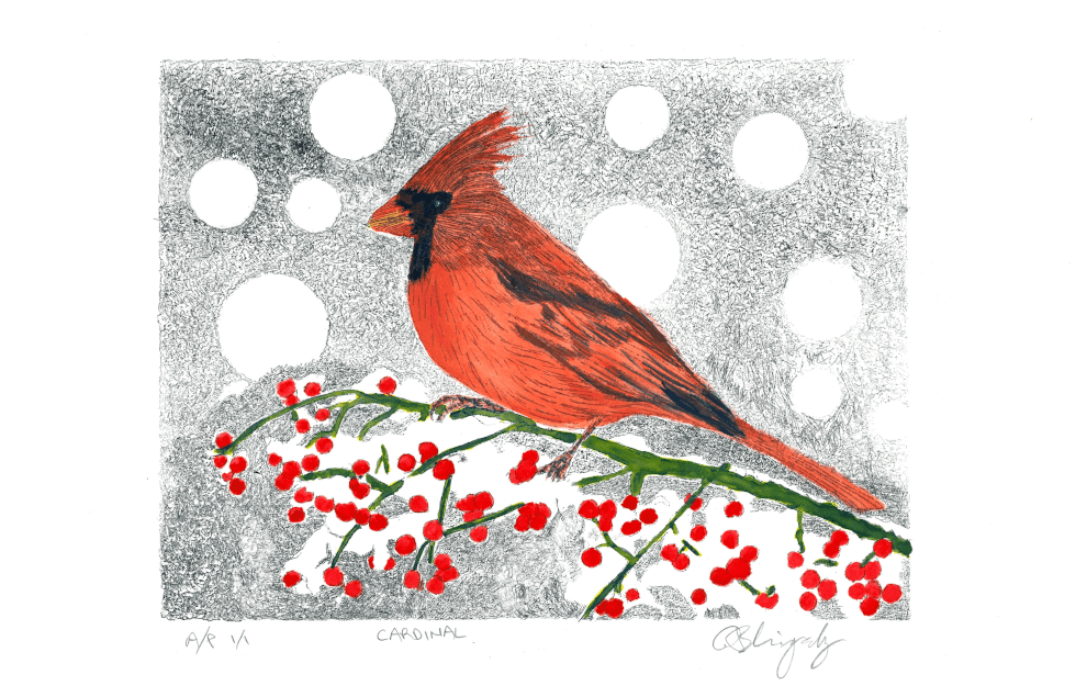 This the first print pulled from my new bottle-jack press. It is a drypoint, inscribed in plastic, with the print then hand painted using watercolour paint. Being the Artist’s Proof the paper size is smaller than the limited edition of 10 will be. This one is 12″x8″ with an image size of 8″x6″, printed using Akua Intaglio ink on Stonehenge Aqua Hot-Pressed watercolour paper. I’m offering this at US$25 including shipping, with the final edition pieces being at least $35. Available direct from me.