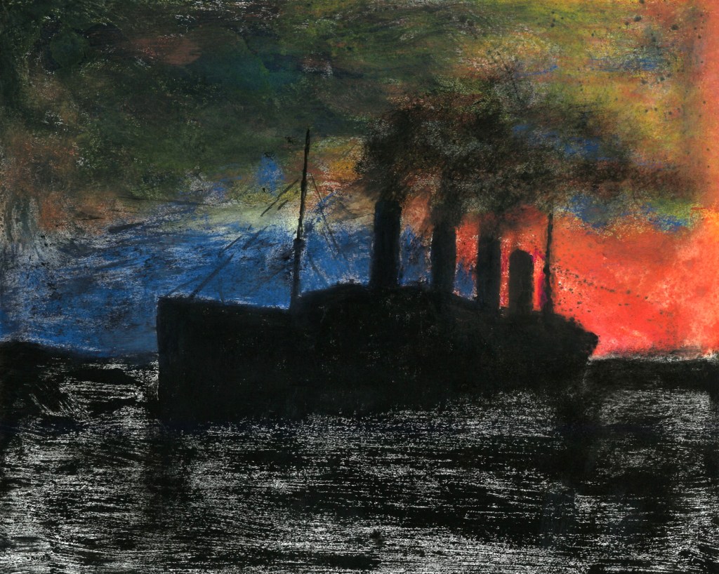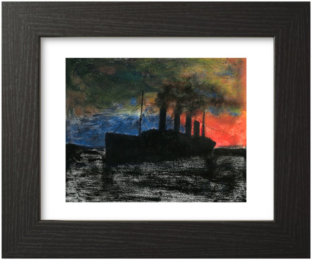 The image depicts the Titanic setting out on her ill-fated maiden voyage, with suitably dark skies ahead foreshadowing her demise. Fun fact, in case you are wondering why there is no smoke coming out of the rear funnel: The Titianic only had three working smoke-stacks. The fourth was for ventilation and design aesthetics only.