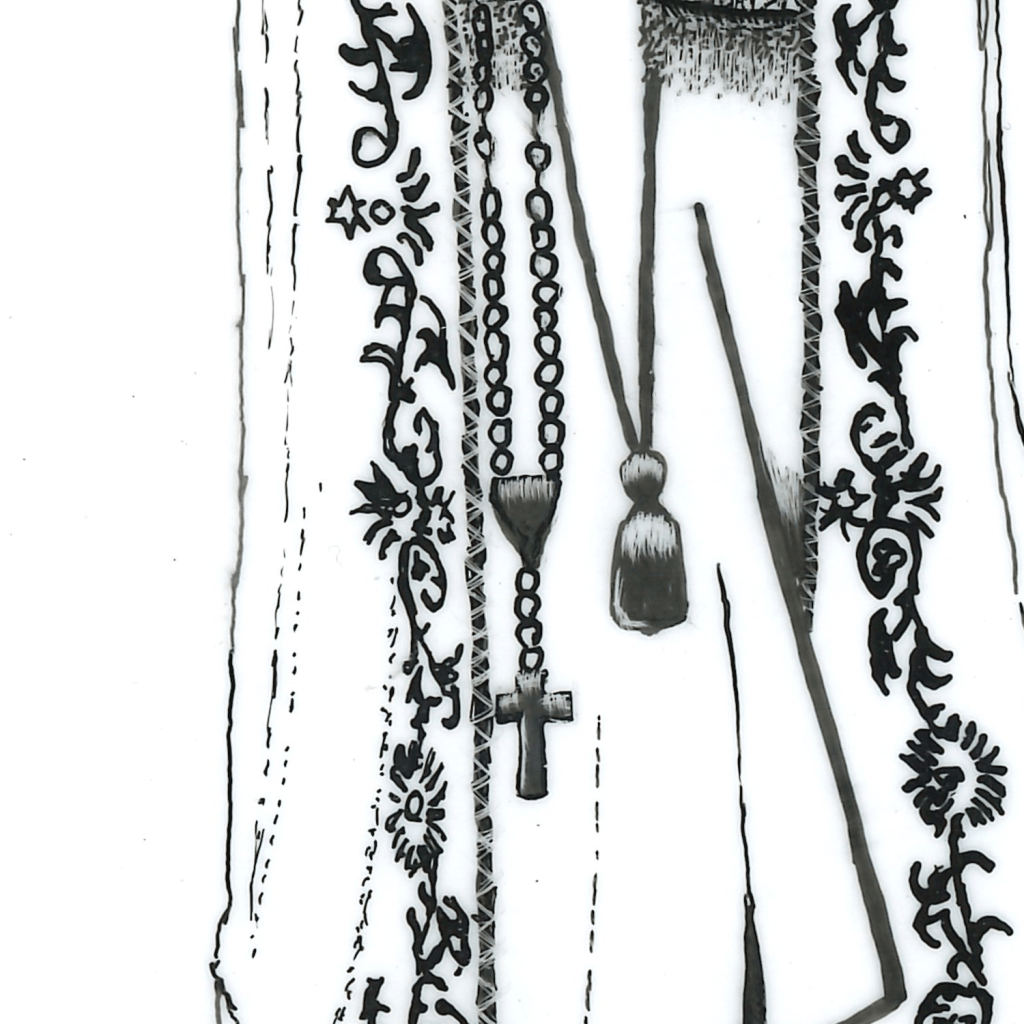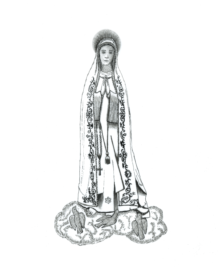The drawing is based off a statue inside Marylake Shrine of Our Lady of Grace, in King City, Ontario.