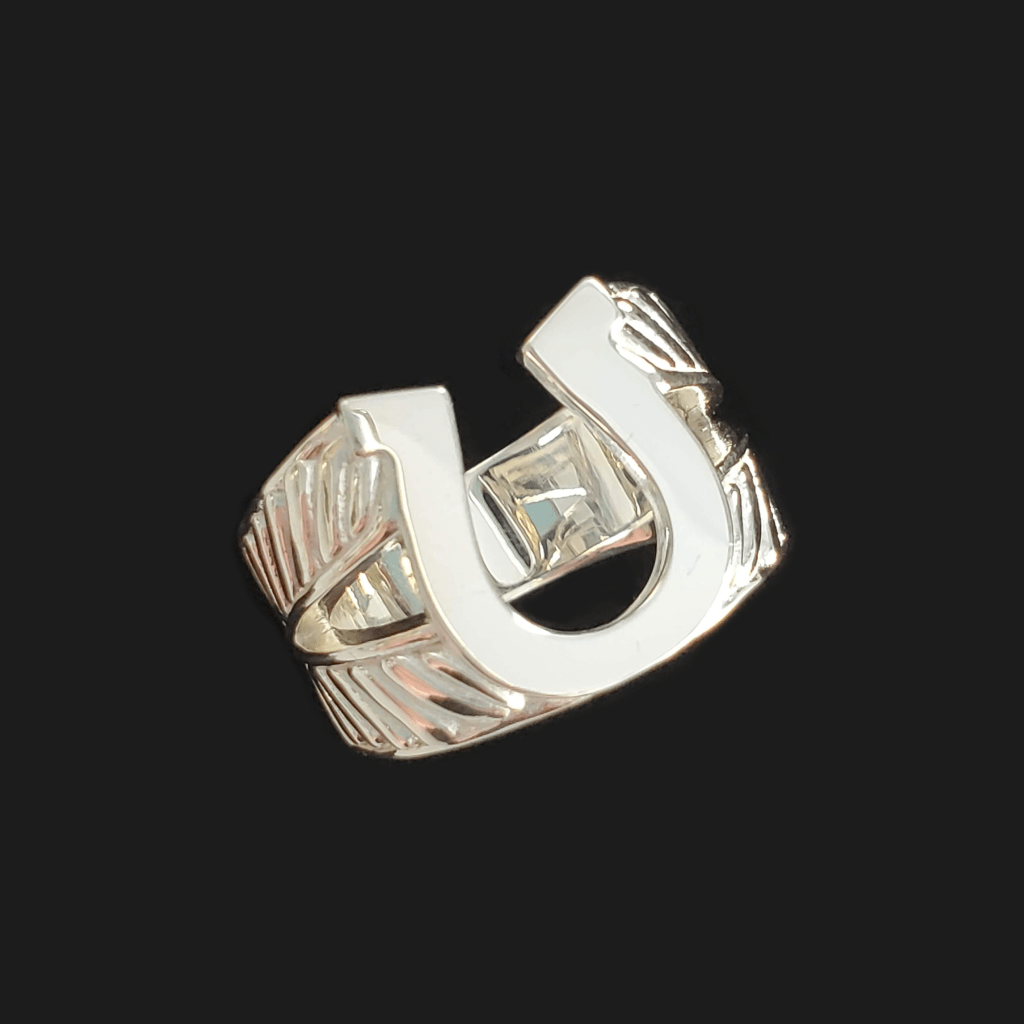This is a horseshoe ring with “braided rope” elements that I designed based on one I saw being worn by the character Raylan Givens on the TV show “Justified”. I have never seen the ring close up but studied it a lot with screen captures from the series.