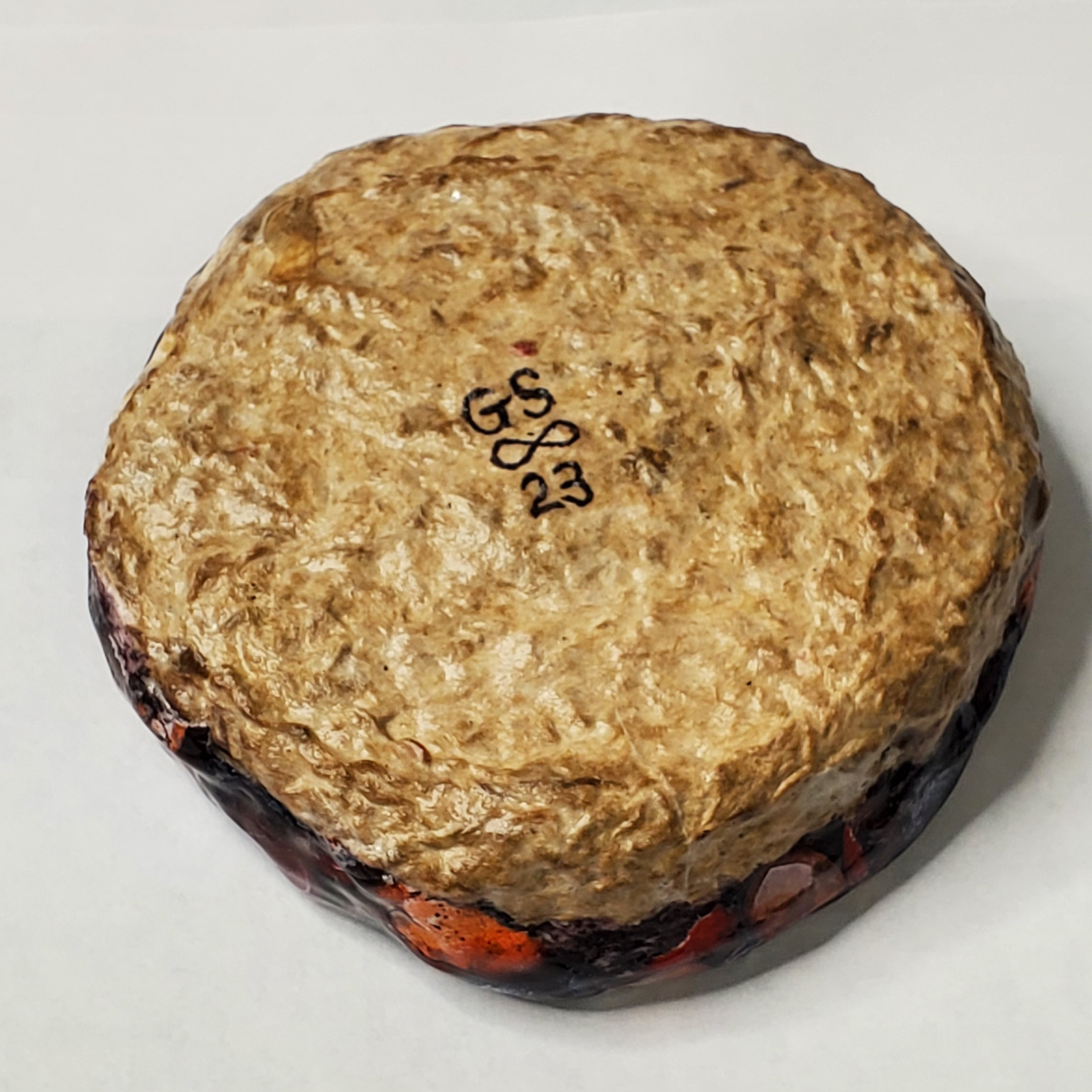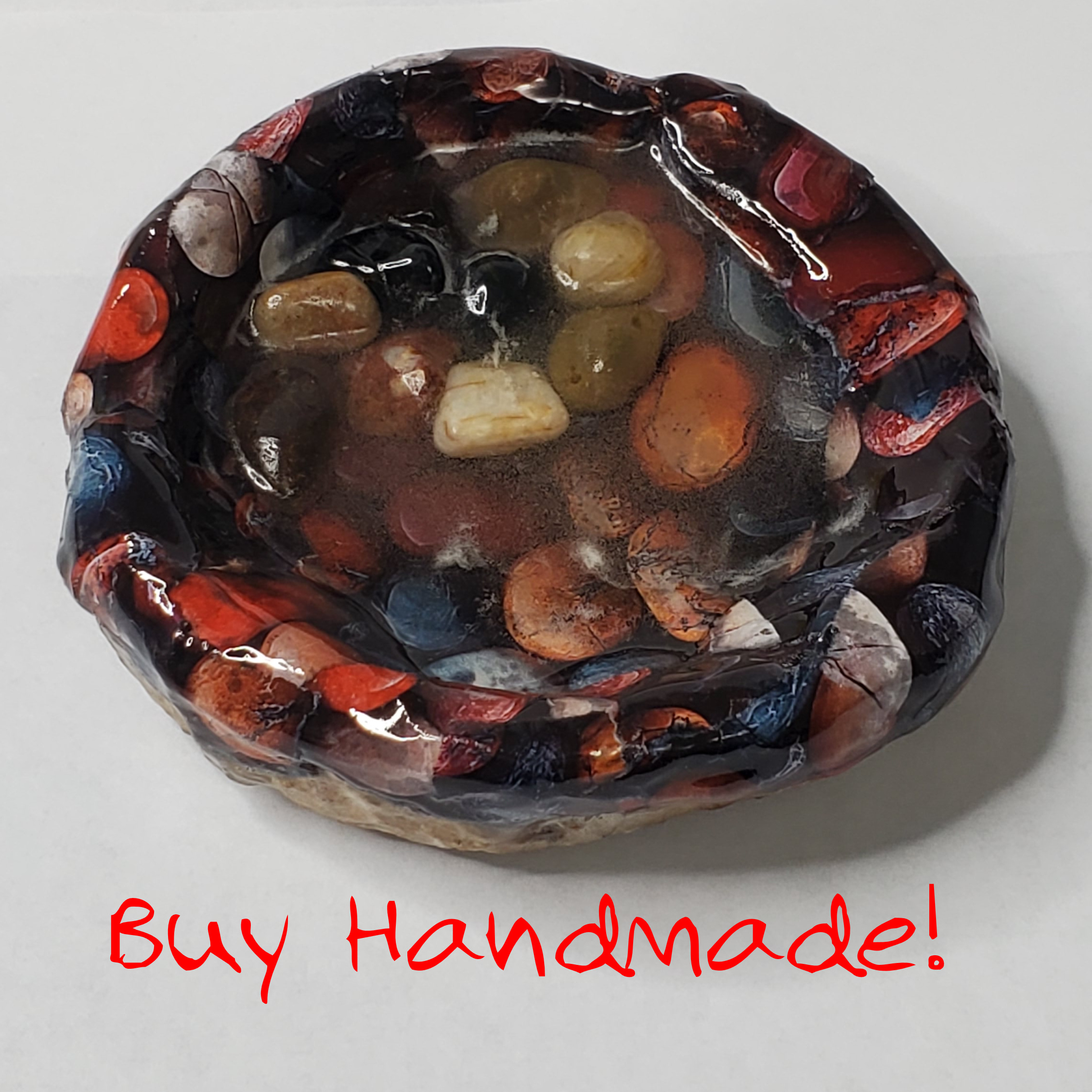 The second completed jewelry or trinket dish as noted from my previous blog post. This one uses real pebbles to one side of the dish that are encased in resin to give it that river’s edge feel. The background of pebbles are my own images that I have decoupaged on the paper mache base. The underside has been coated in exterior grade urethane and the entire top is resin coated. It measures approximately 4 inches in diameter.