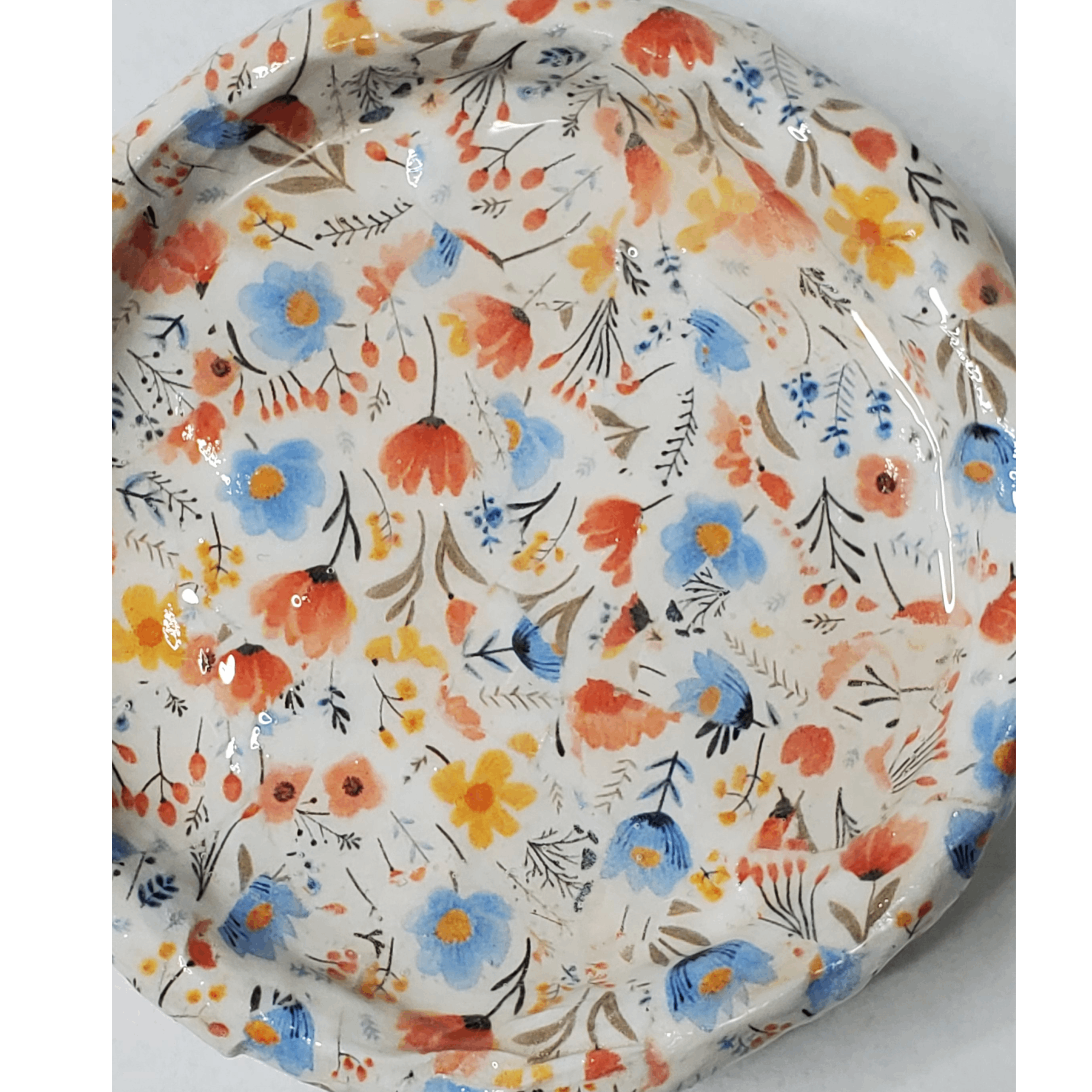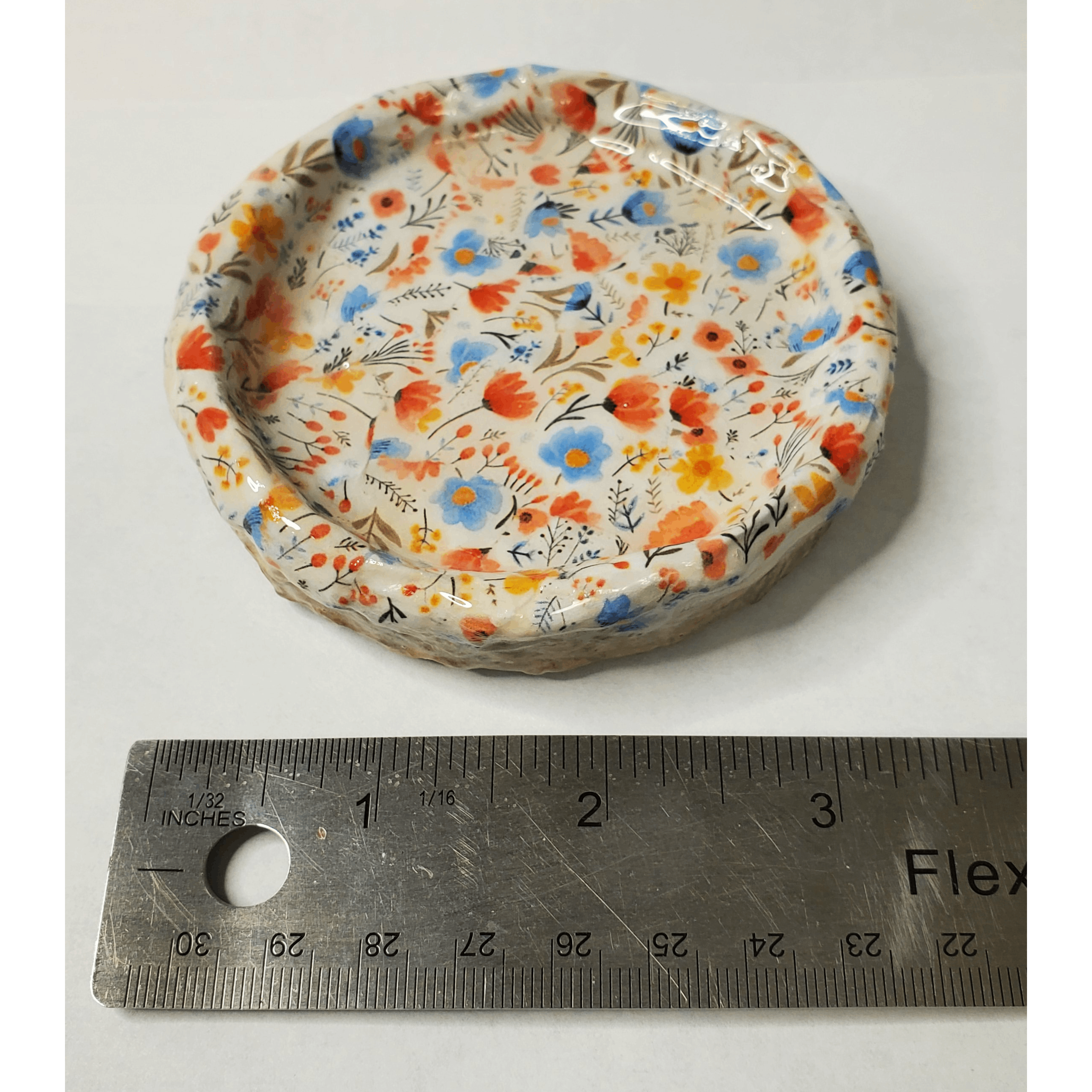 This is my latest trinket or jewelry dish that features a decoupaged spring flowers pattern (my image) on the top surface which has been coated with resin. The underneath has been sealed with exterior grade urethane. The dish is made of papier mache which is a lightweight but strong material – there are pieces from antiquity that are hundreds of years old!