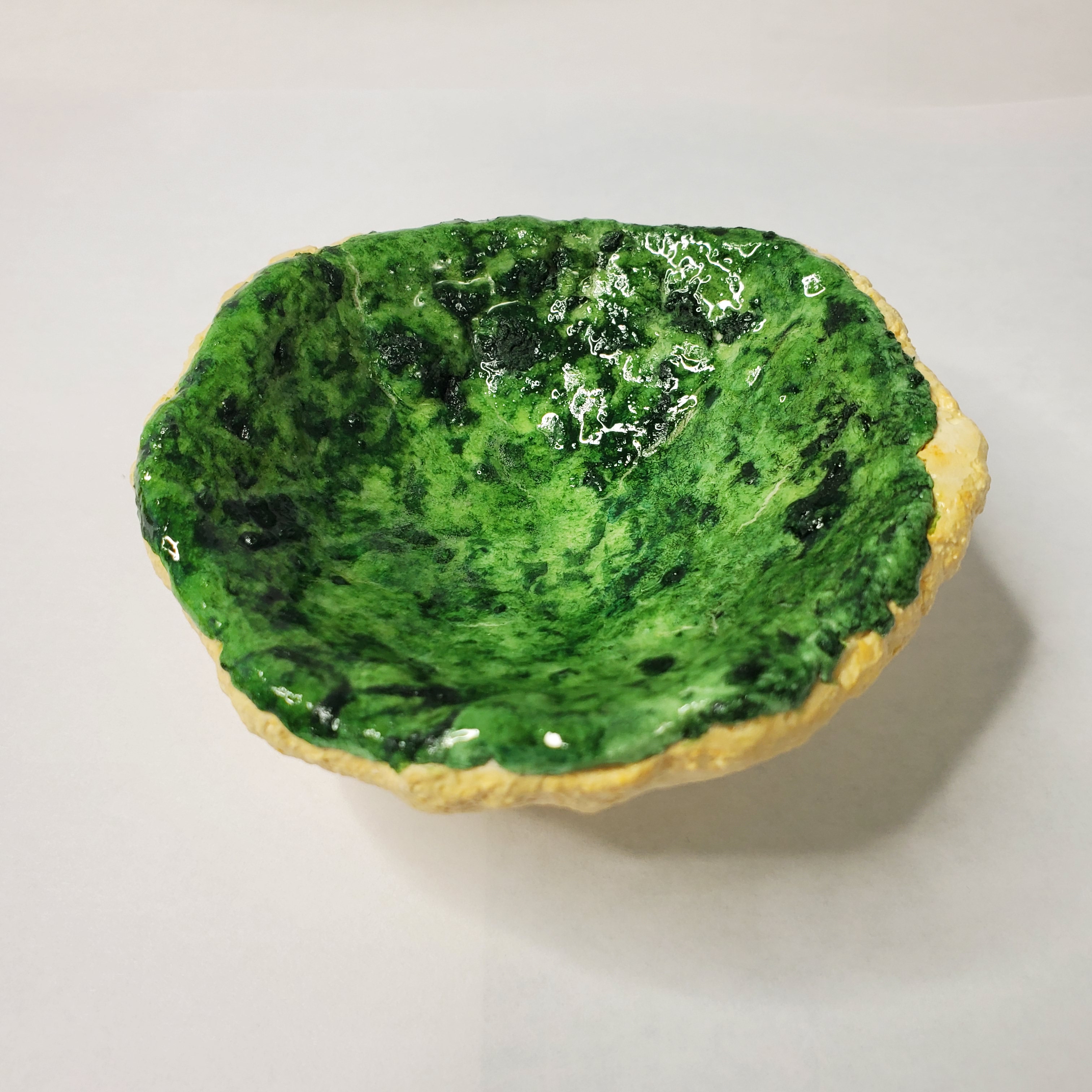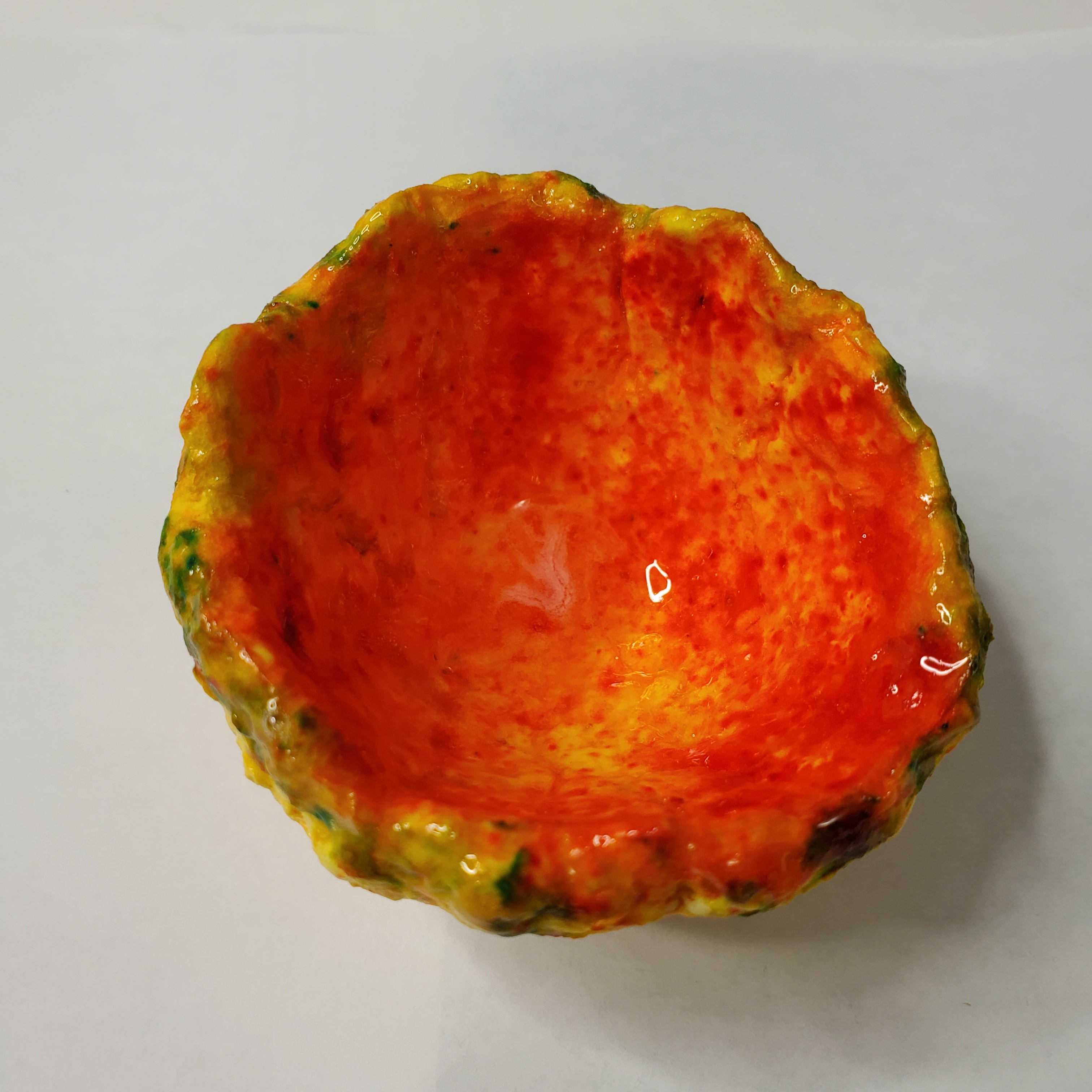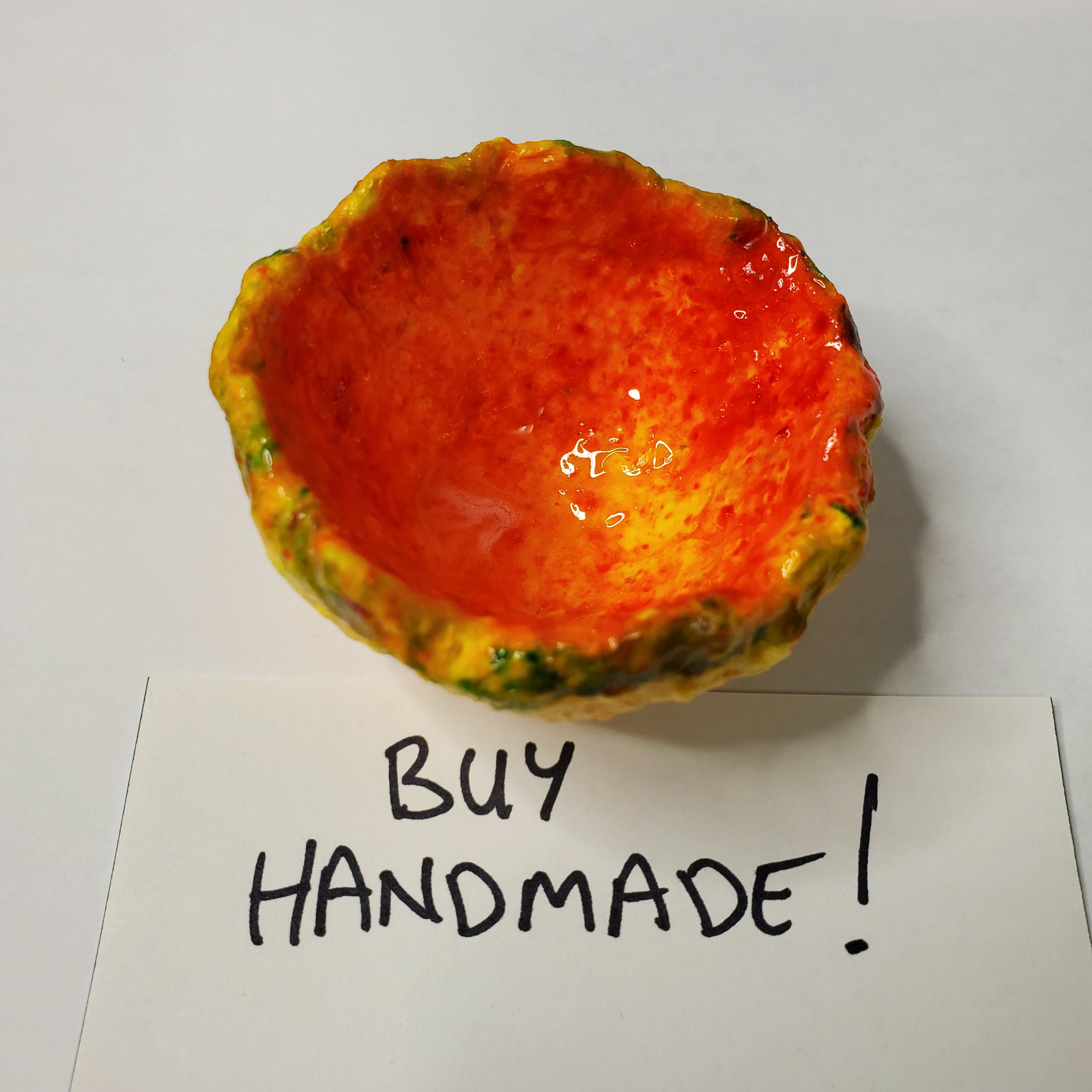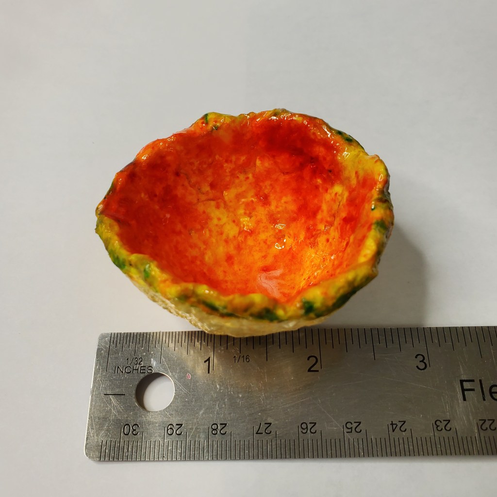 Each is approx 3 inches in diameter and made from my recycled paper pulp to form a mushy papier mache (no flour used) which I then compress and form into shapes. They are surprisingly resilient to damage and take much more abuse than clay or ceramic pieces. The inside part of each is coated with resin and the underside is protected with an outdoor-grade urethane. Although very water resistant they should not be soaked in water. Simply clean with a damp cloth.