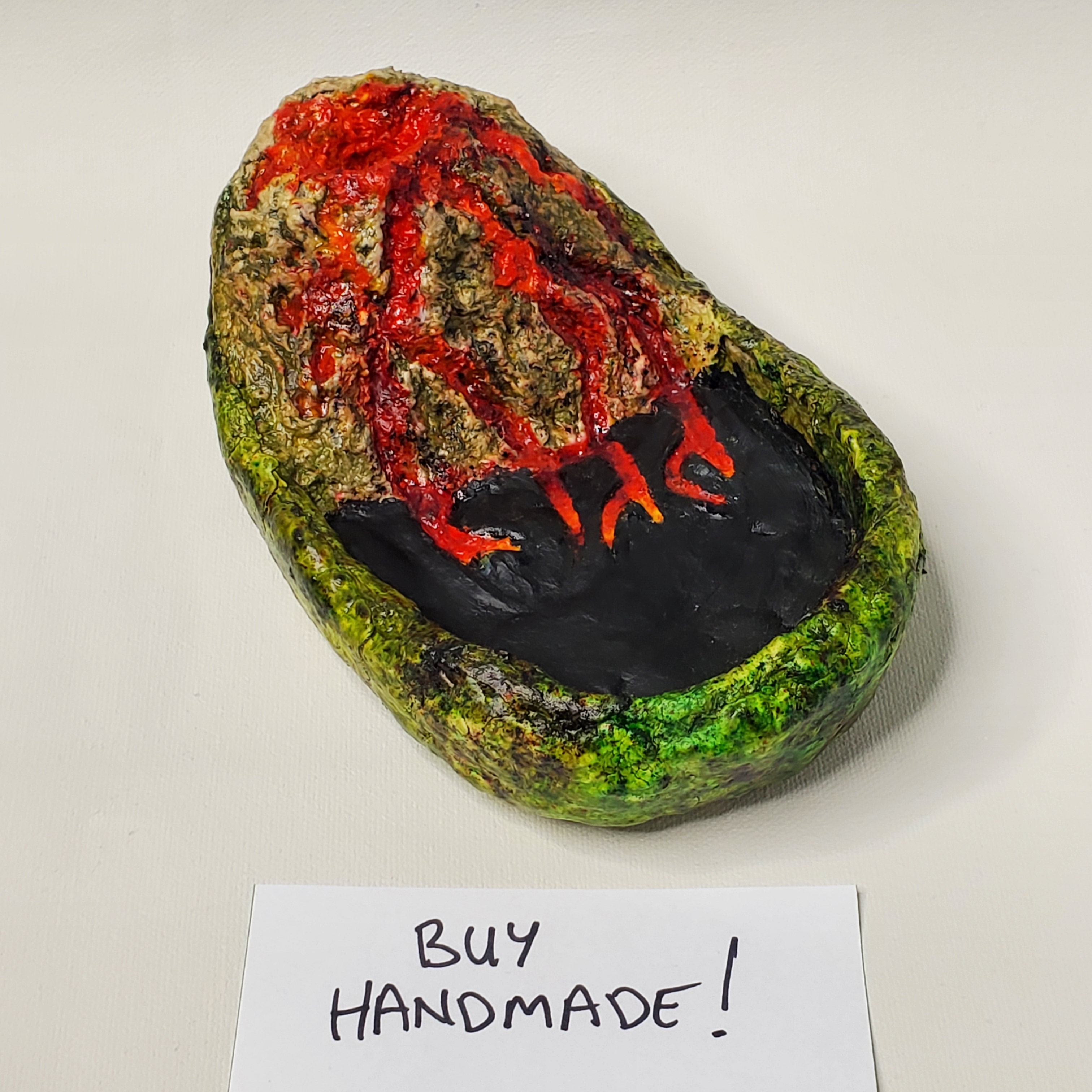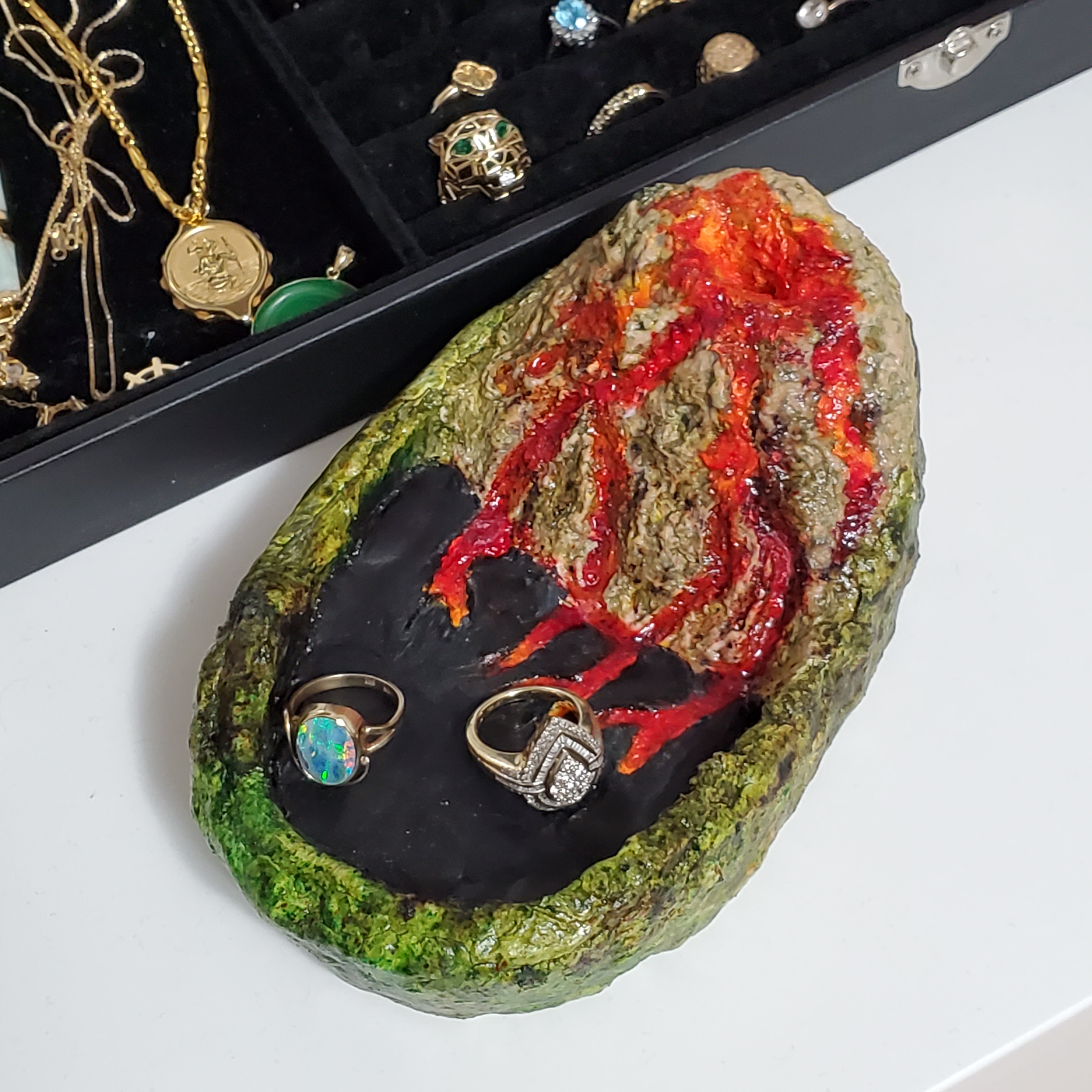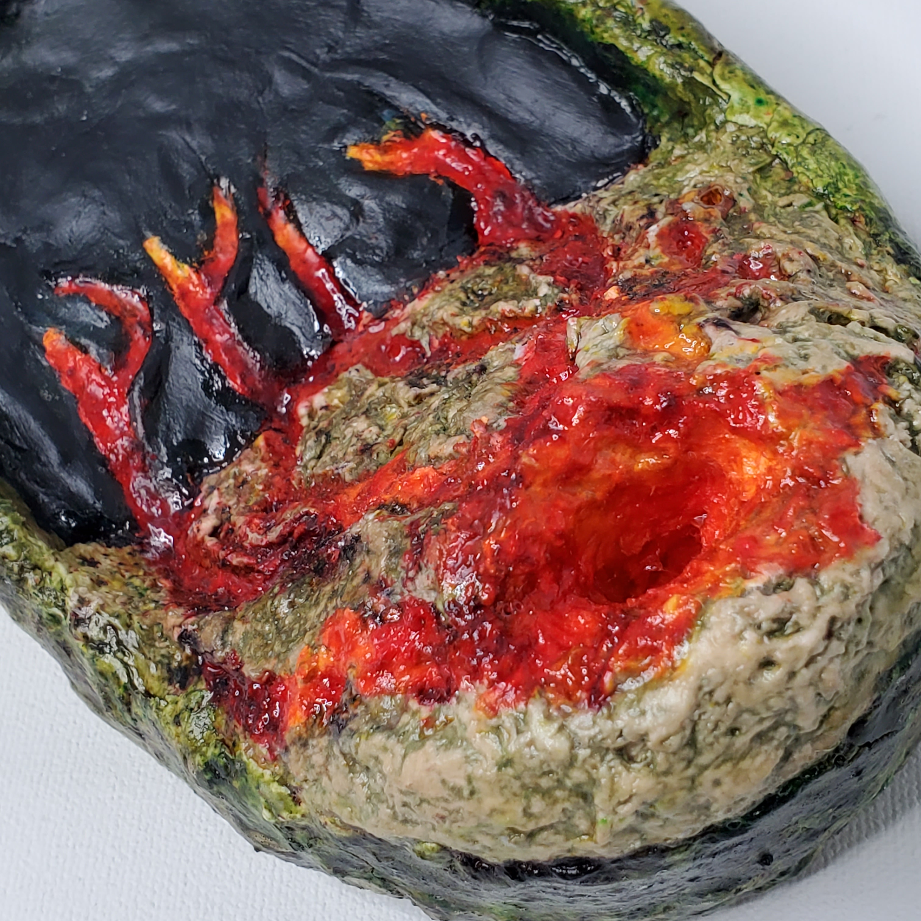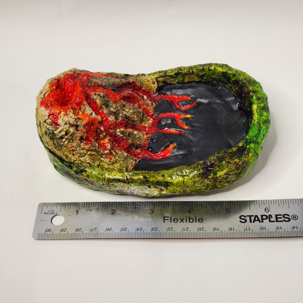 This is another jewellery/trinket dish that I competed earlier this year. This one depicts a volcano rising above a forest landscape, complete with flowing and cooled lava. It measures 6-inches in length and is made from paper pulp and polymer clay, painted and coated in exterior grade urethane.