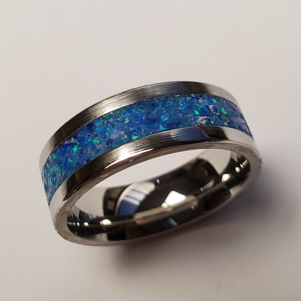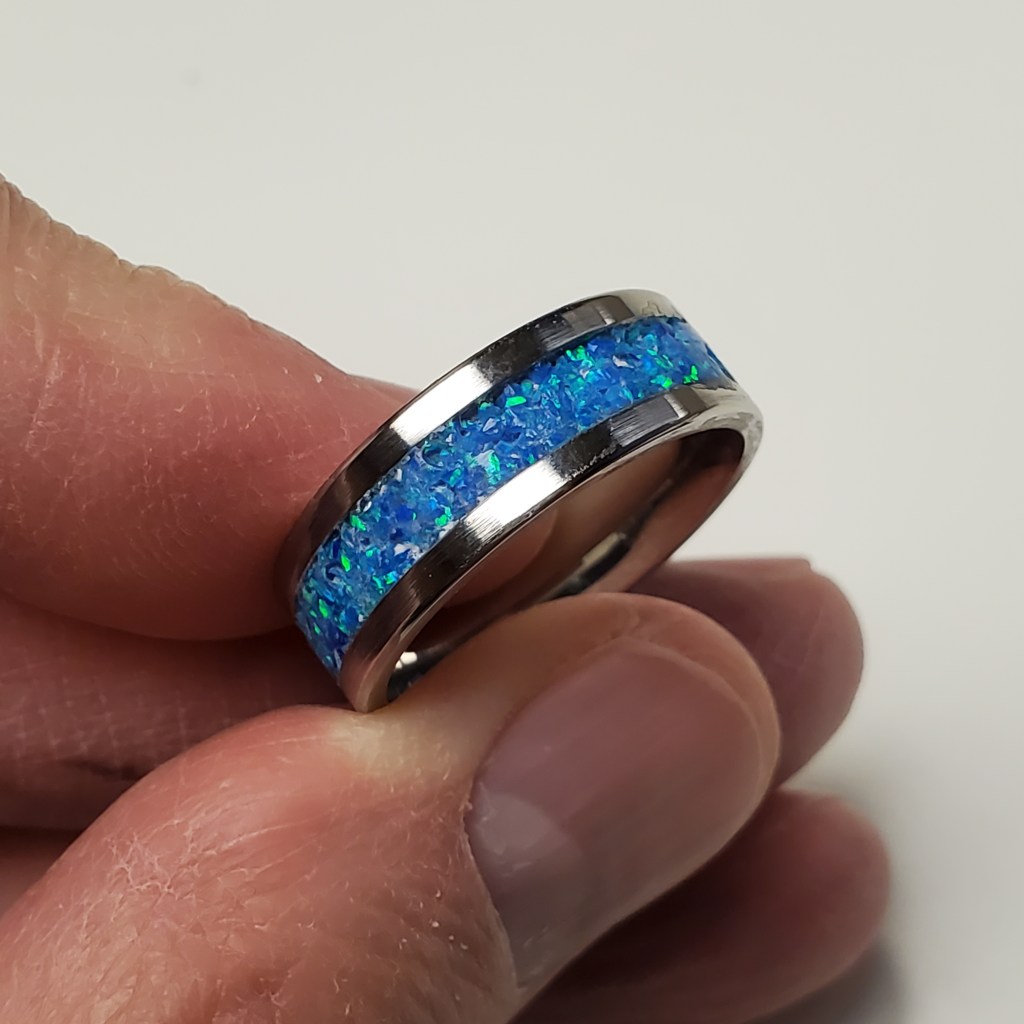 I finally got around to making something for myself! I’ve always liked the look of the Channel Ring with various bands displayed between the outer metal bands, and decided to make one for myself. This one is stainless steel and crushed opal in a comfort-fit band. The photo’s really don’t do it justice; the blues and greens really sparkle in the light. Having made this one I will now be making more with different band inserts.