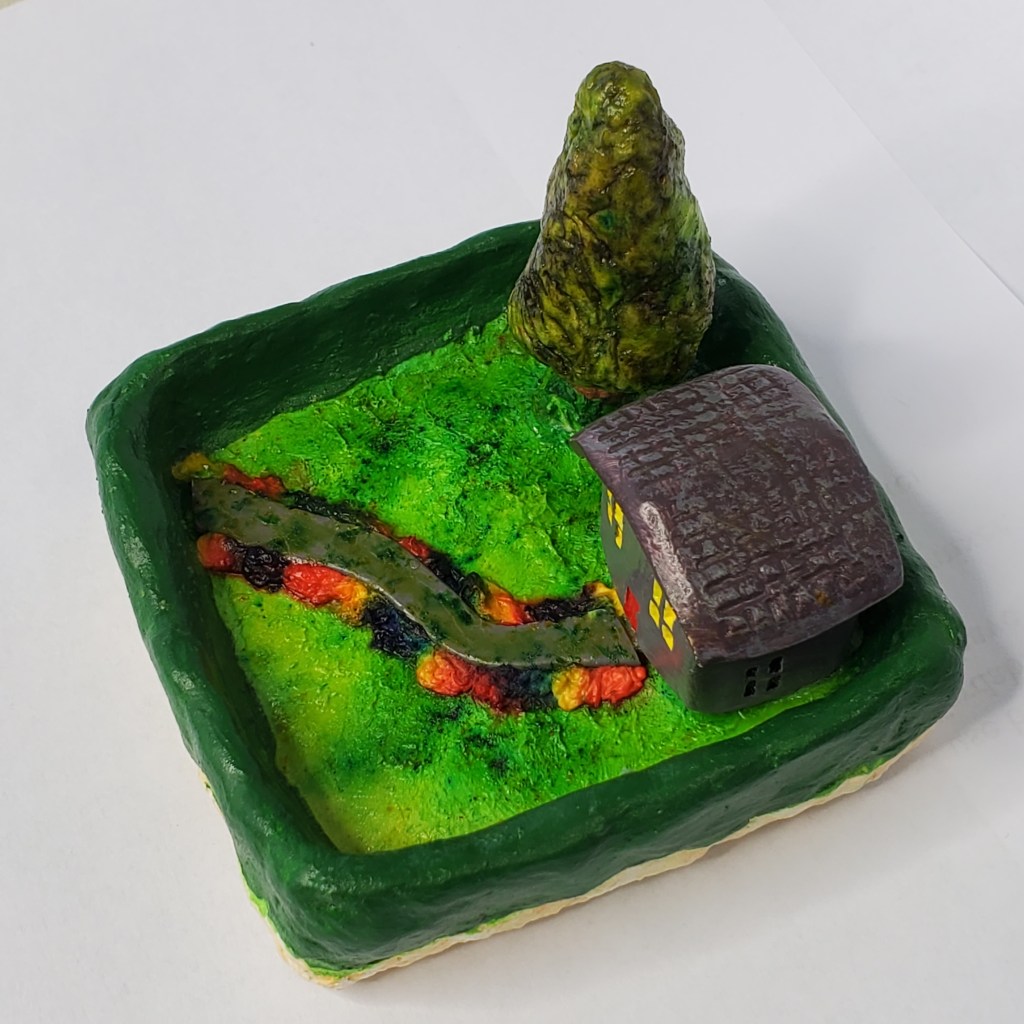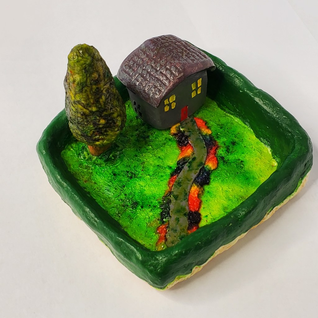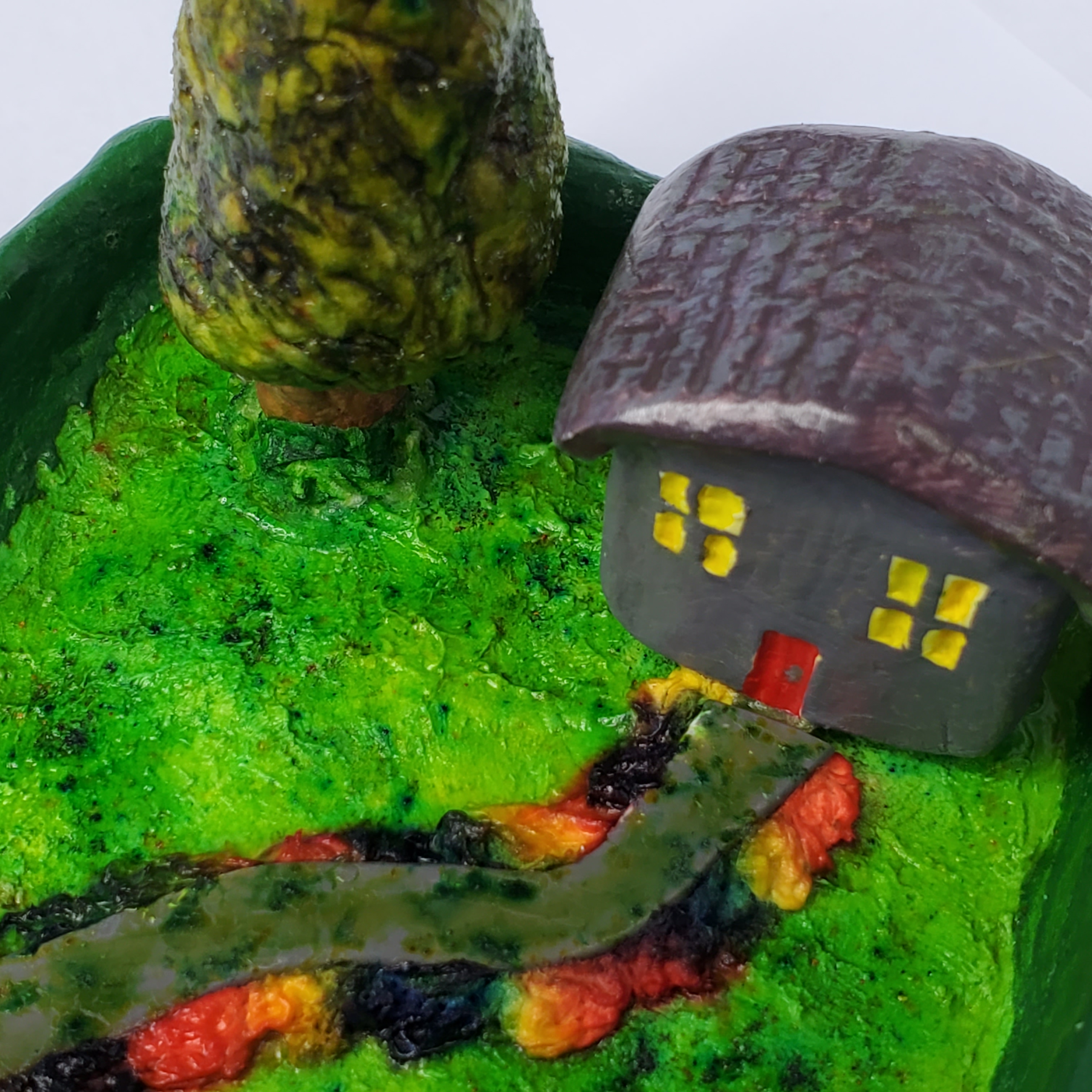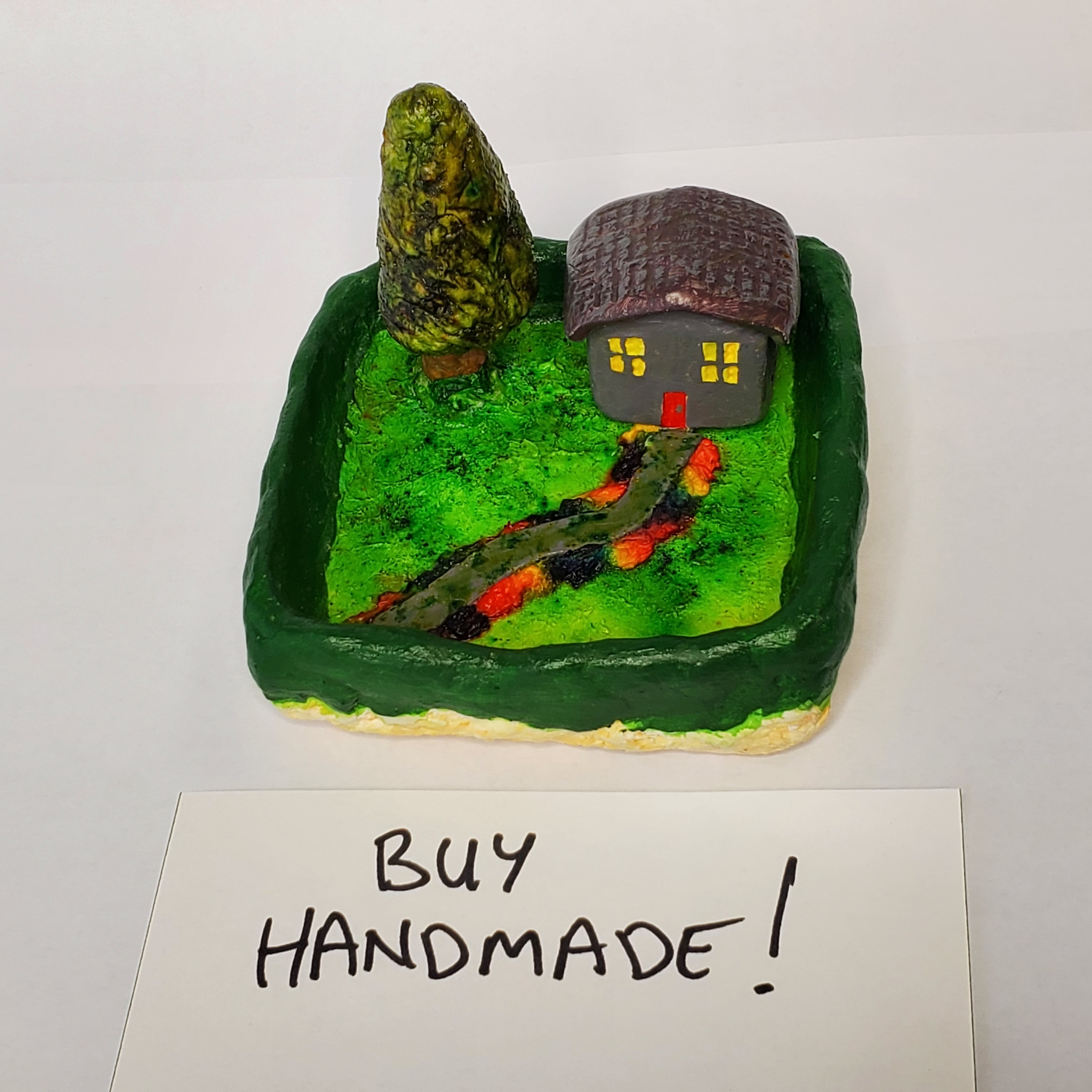 This is made of polymer clay and papier mache pulp that I make myself, and features a cute little house in a garden setting.