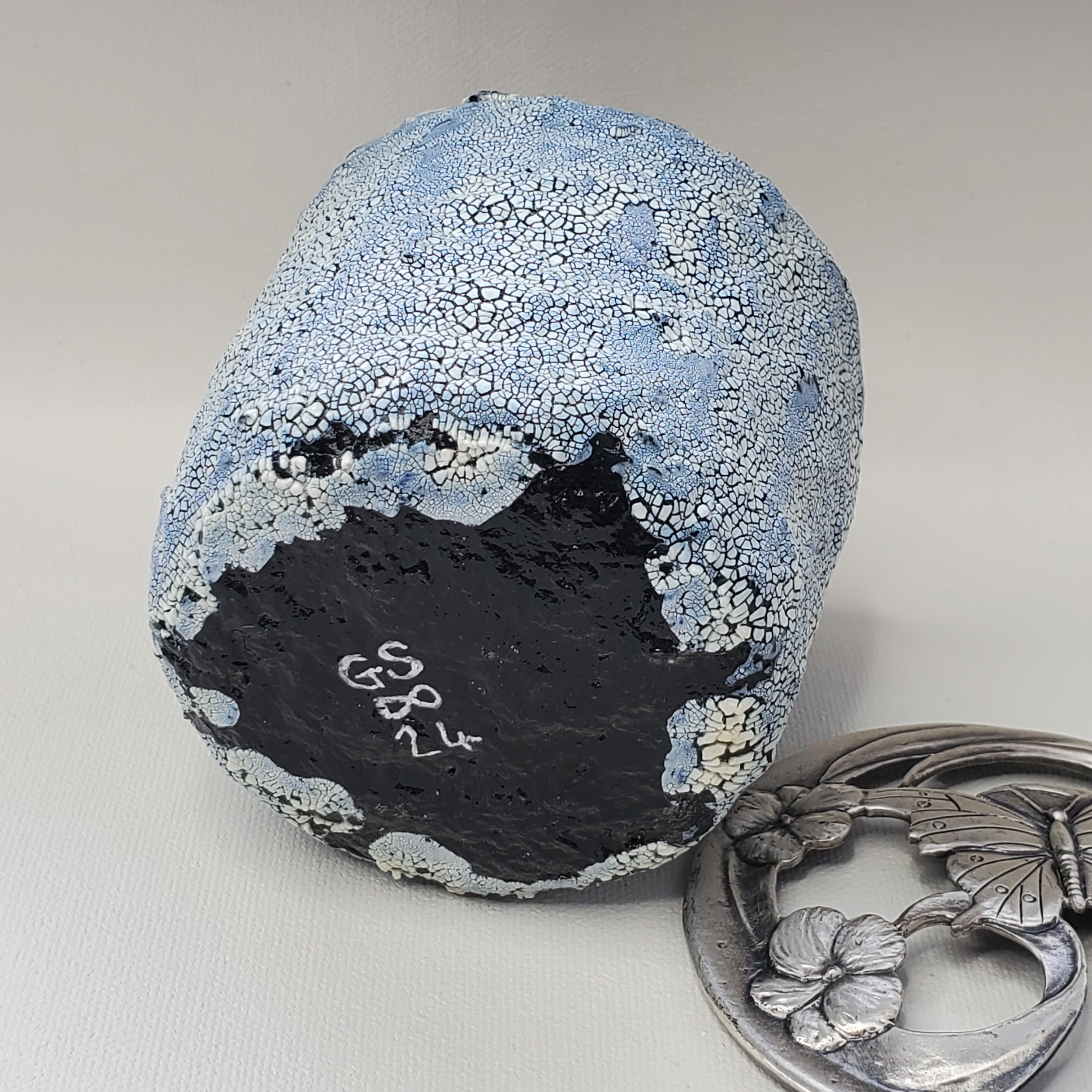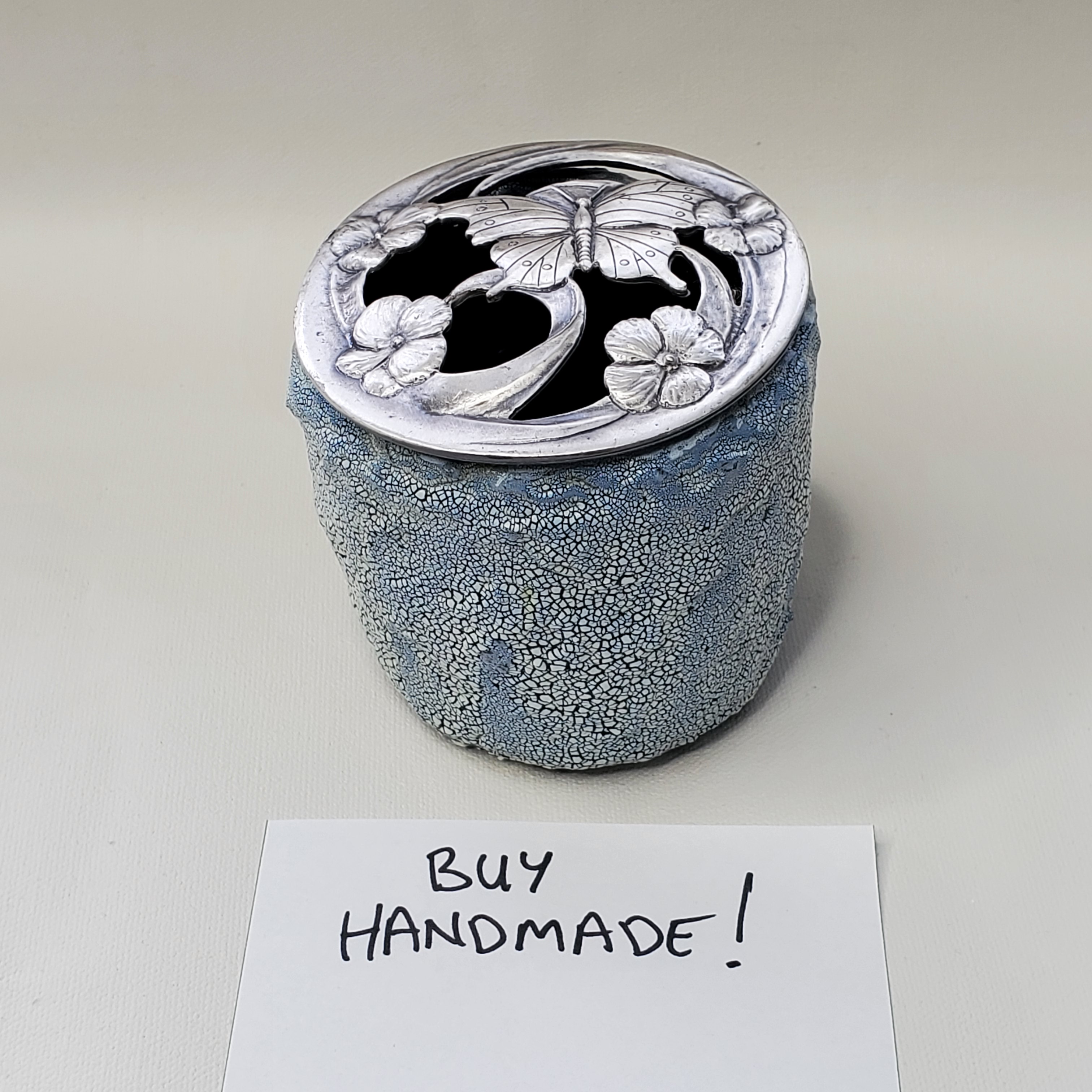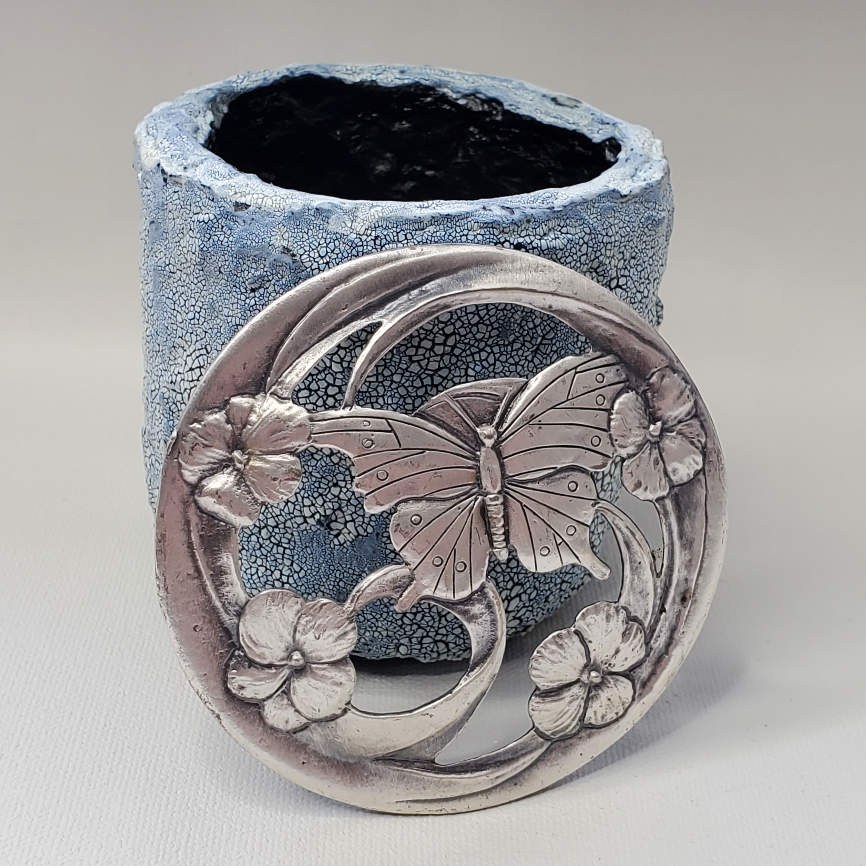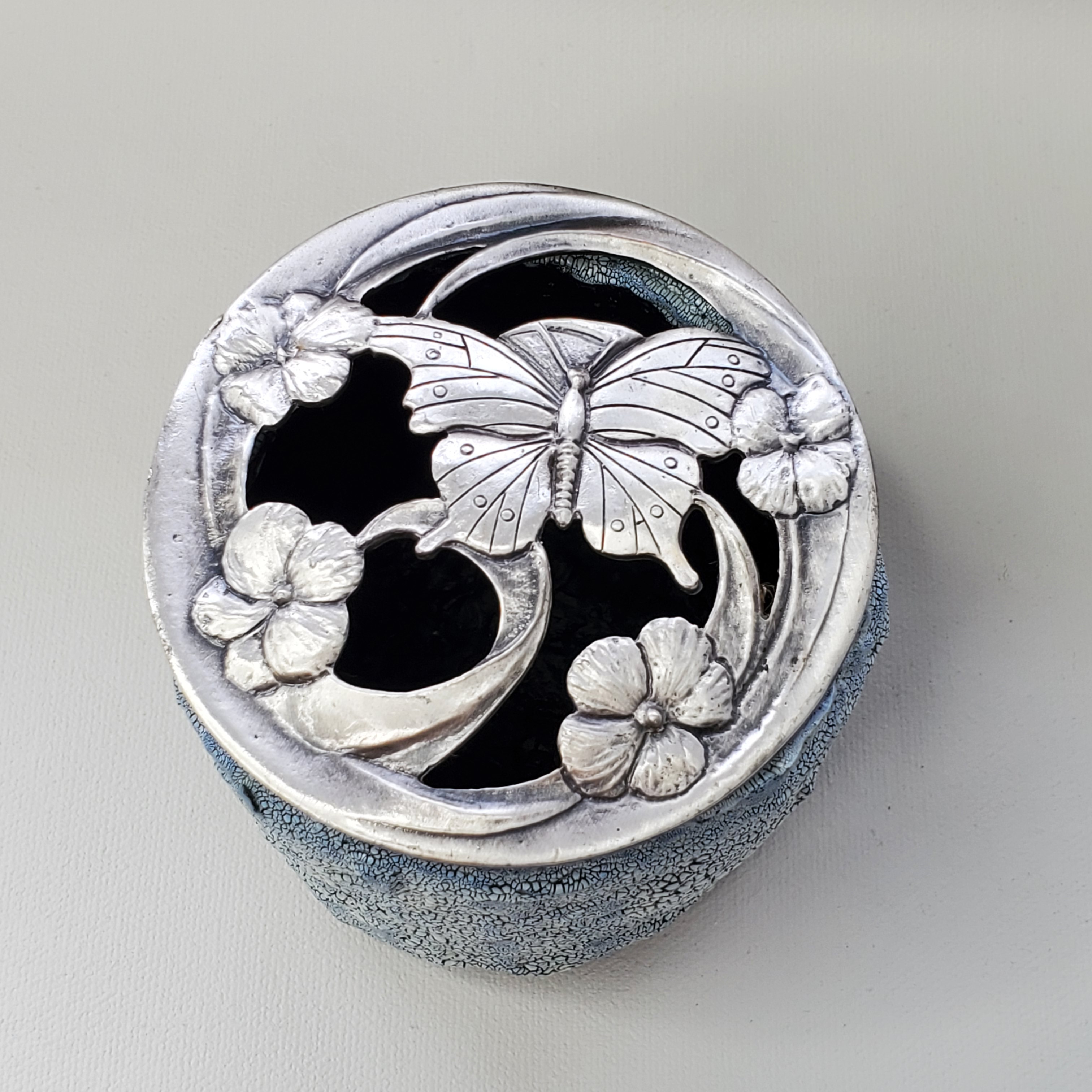 I finished this potpourri container recently and used a crackle finish on it as I did with my last jewellery dish. The pewter finish metal lid is something I purchased over 20 years ago and intended to use in a woodworking project of some kind but never did!