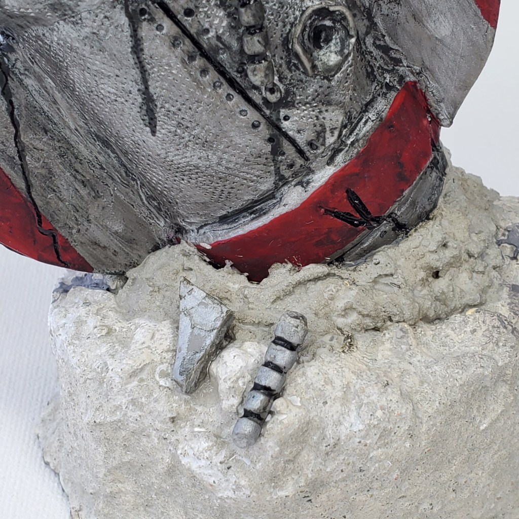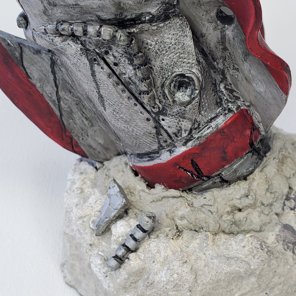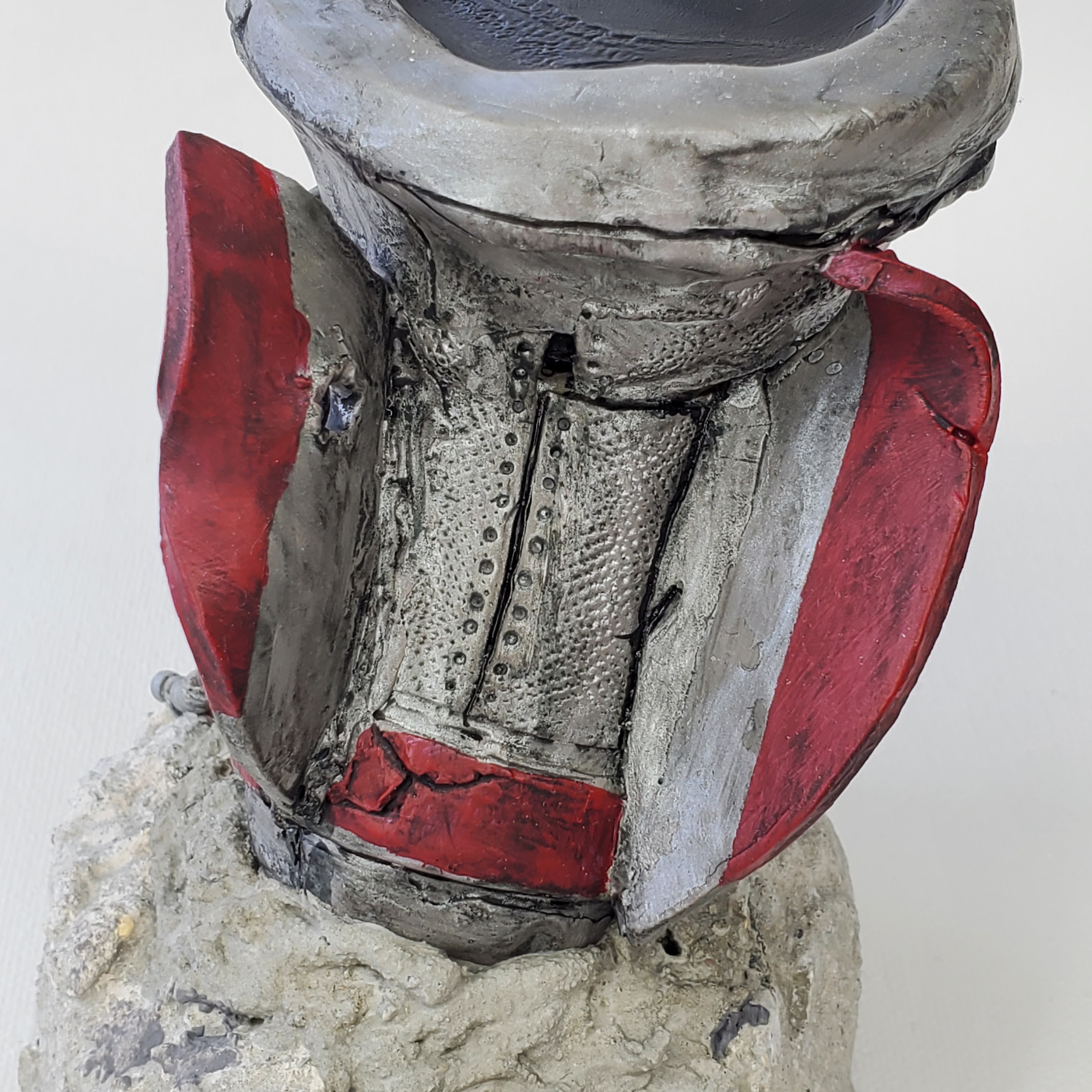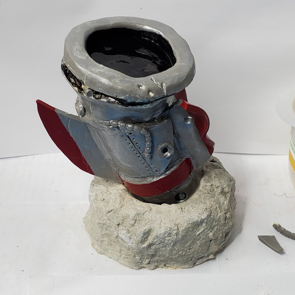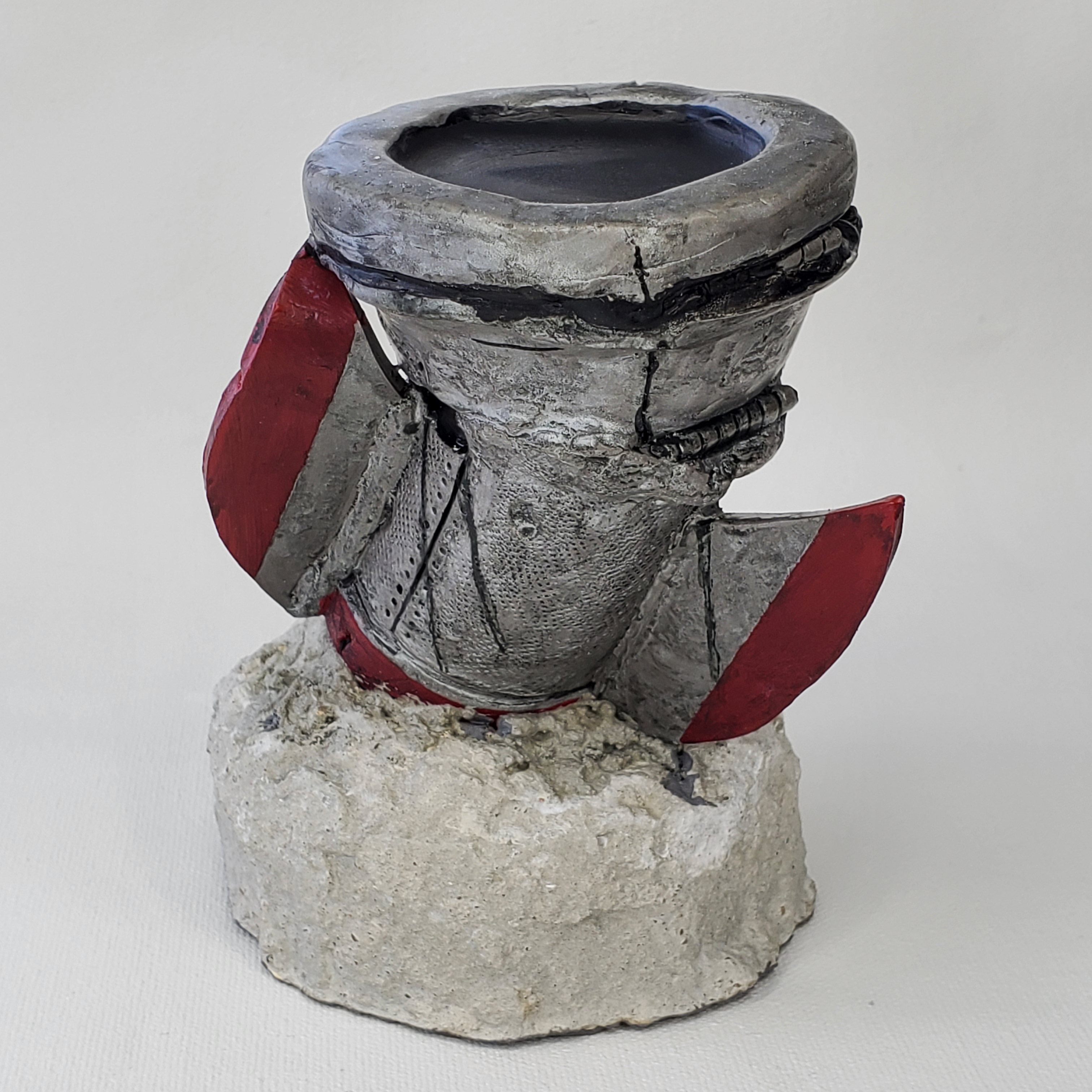 I created this a while back. I made the lightweight concrete base with no idea what I was going to put on top. It sat in my studio for weeks before I finally hit upon this idea – for no particular reason. I modeled the spaceship over top of a toothpick holder, which is what I had been staring at for a while wondering what I could make out of it (as one does, haha). It is mostly polymer clay but with some small parts made out of Milliput epoxy. Finally, instead of making the engine exhaust port concave I closed it off and painted it black so that a tealight candle could be put on top if one wanted to. It measures 4.5 inches in height and width. Here are some photo’s of the finished piece and some in-progress shots.