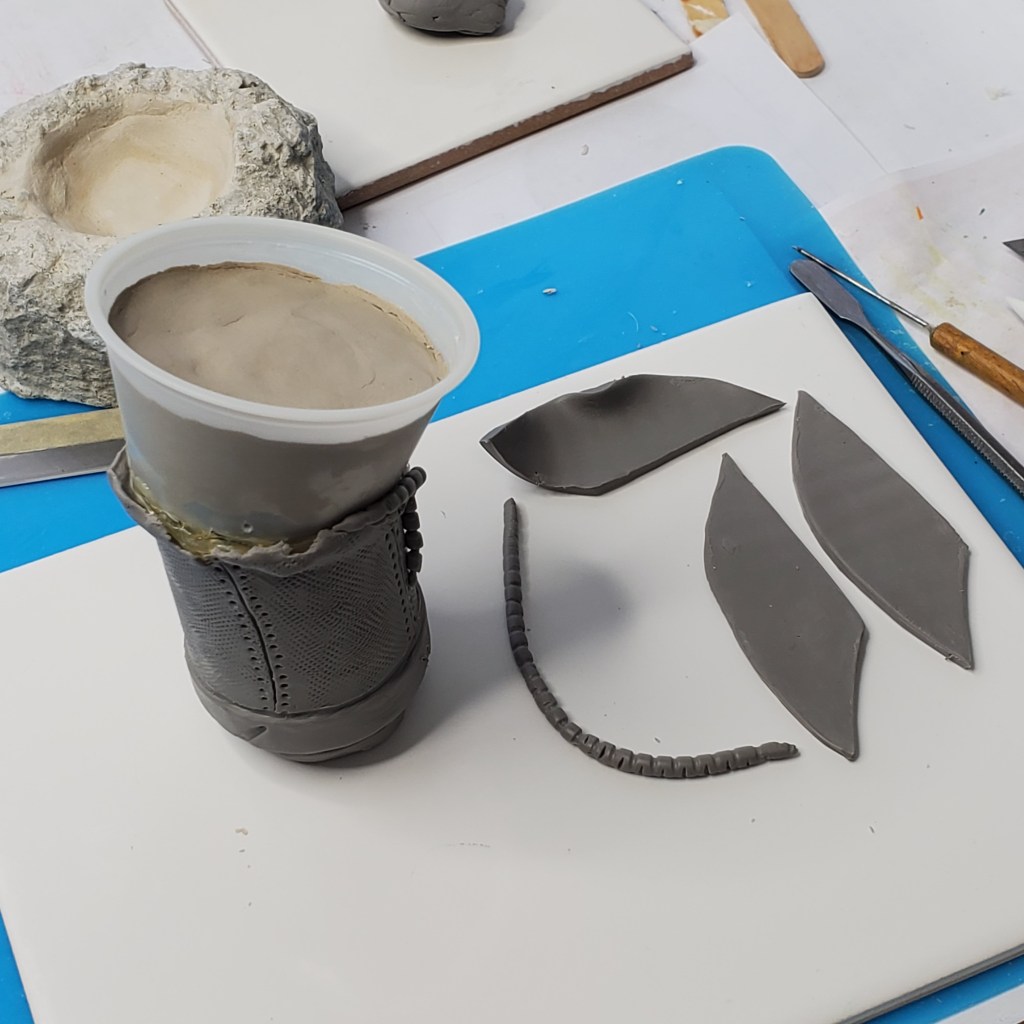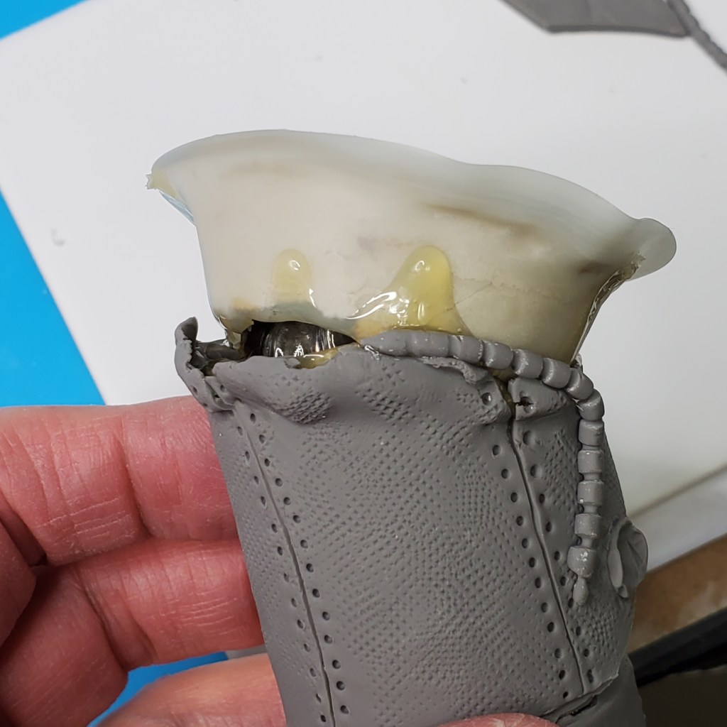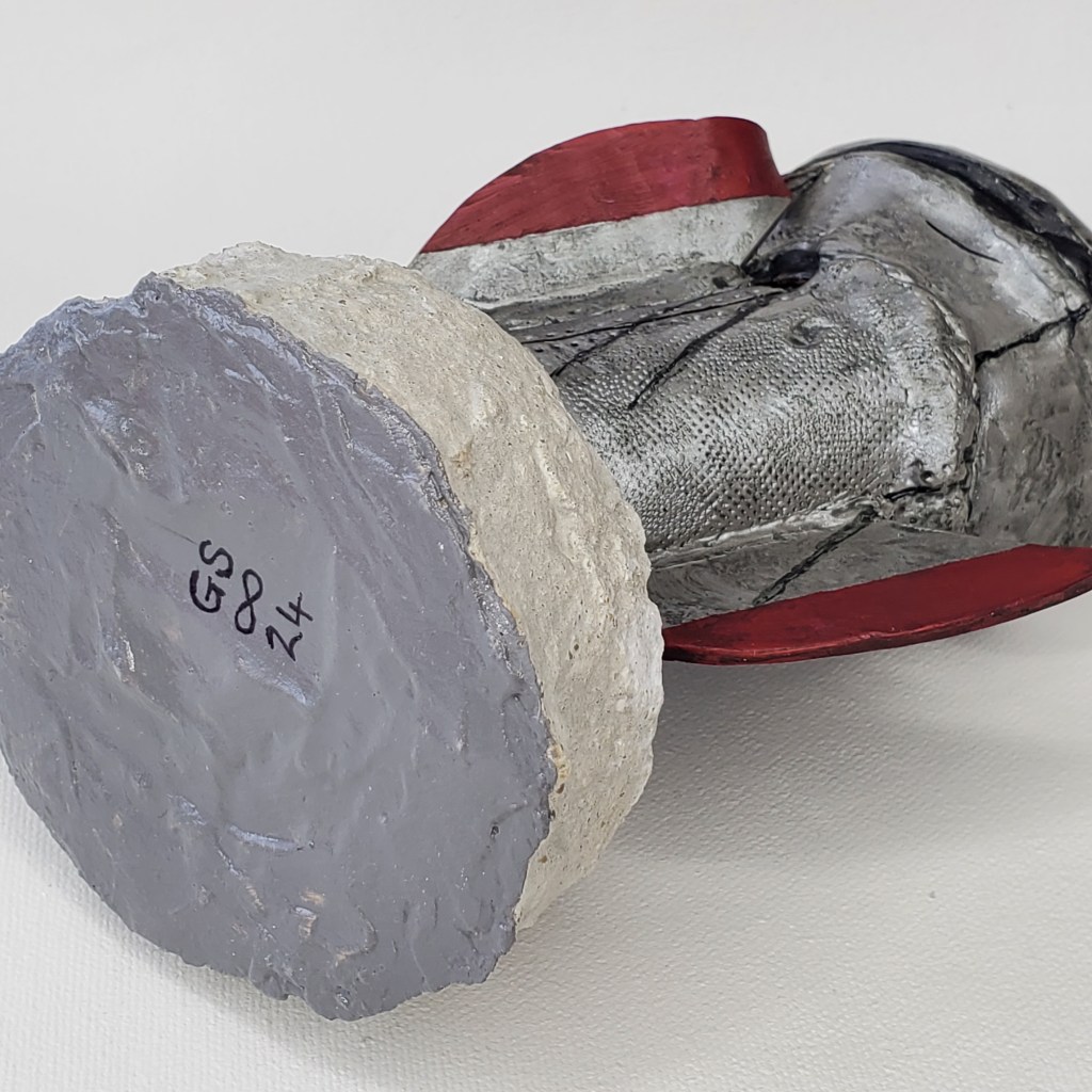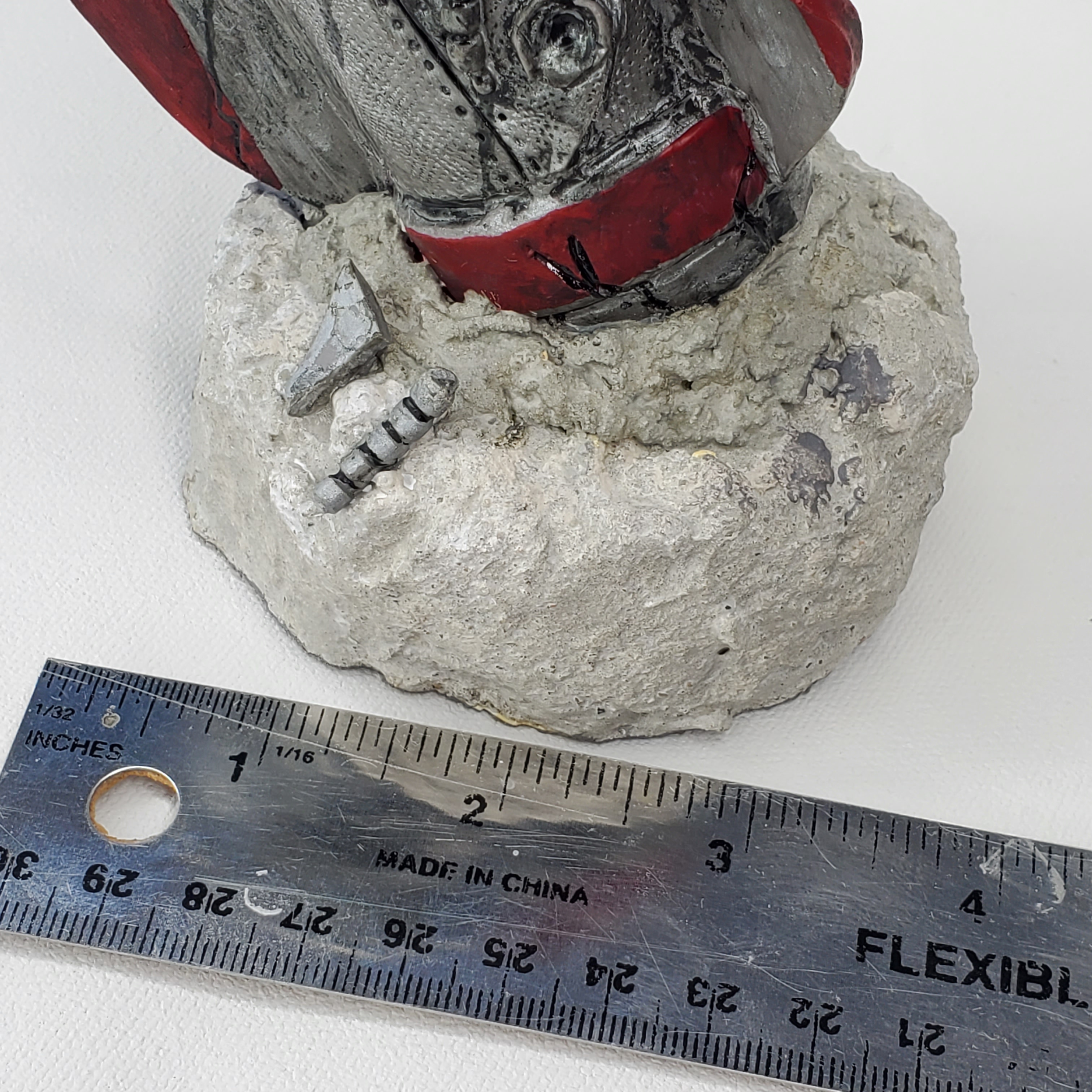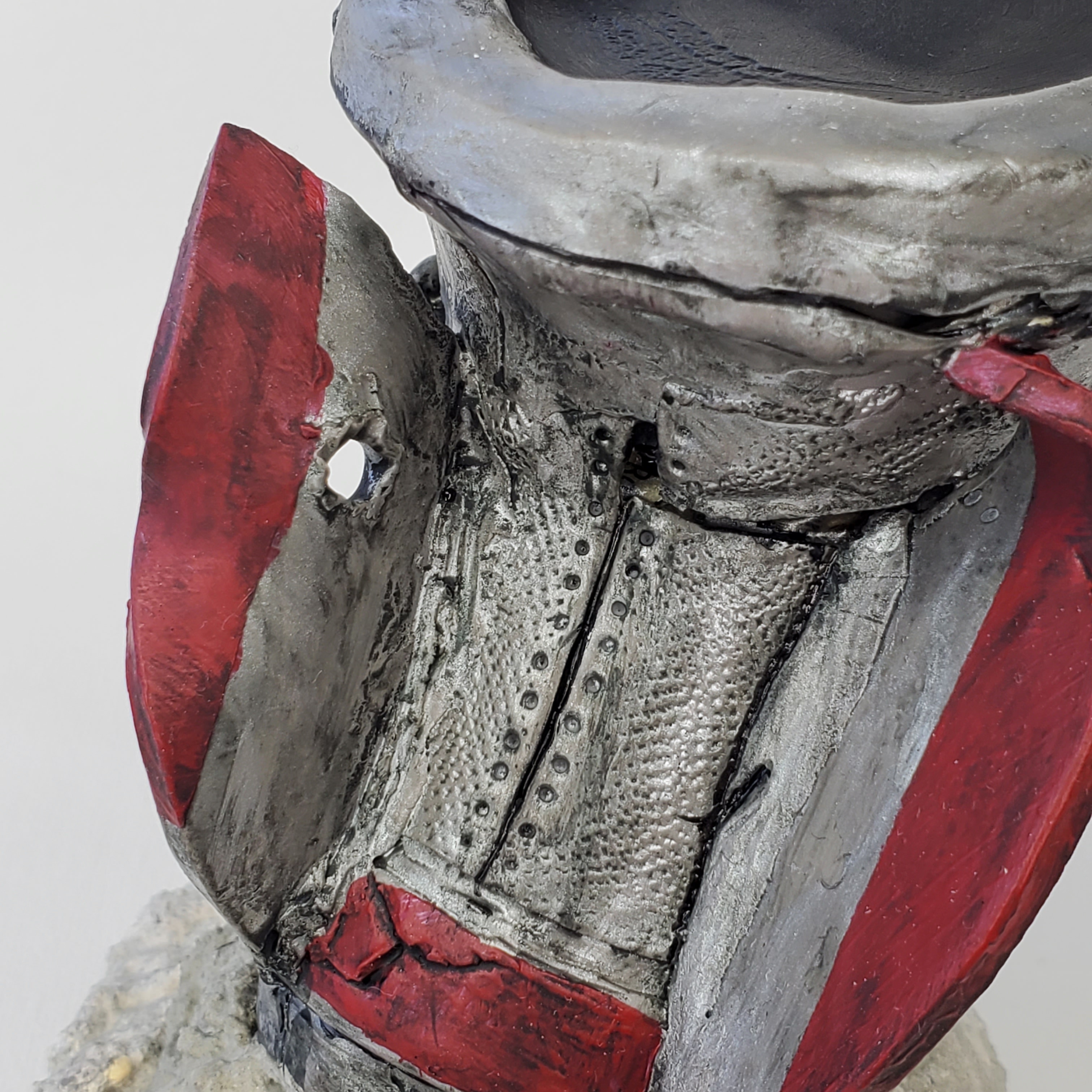 I created this a while back. I made the lightweight concrete base with no idea what I was going to put on top. It sat in my studio for weeks before I finally hit upon this idea – for no particular reason. I modeled the spaceship over top of a toothpick holder, which is what I had been staring at for a while wondering what I could make out of it (as one does, haha). It is mostly polymer clay but with some small parts made out of Milliput epoxy. Finally, instead of making the engine exhaust port concave I closed it off and painted it black so that a tealight candle could be put on top if one wanted to. It measures 4.5 inches in height and width. Here are some photo’s of the finished piece and some in-progress shots.