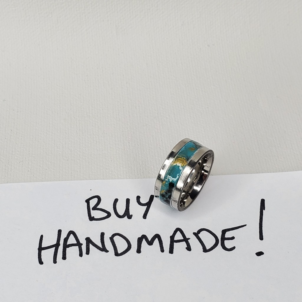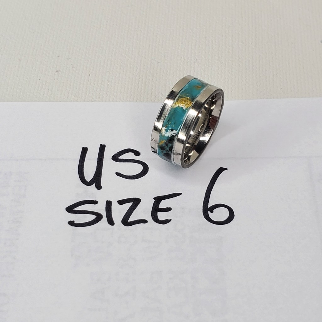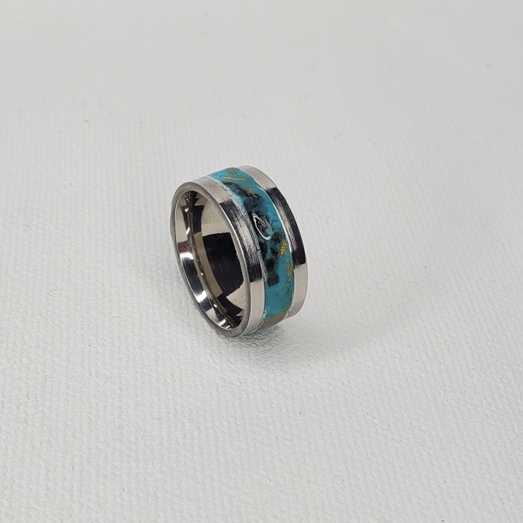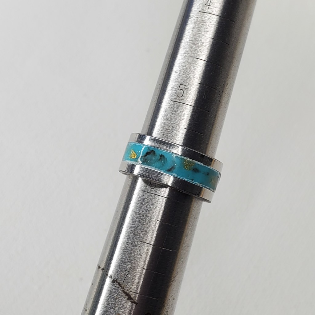 This is the first of a handful of rings I made a couple months ago creating inserts for stainless steel channel rings. The insert was made with Polymer Clay and Resin and is a turquoise color with black and gold highlights.