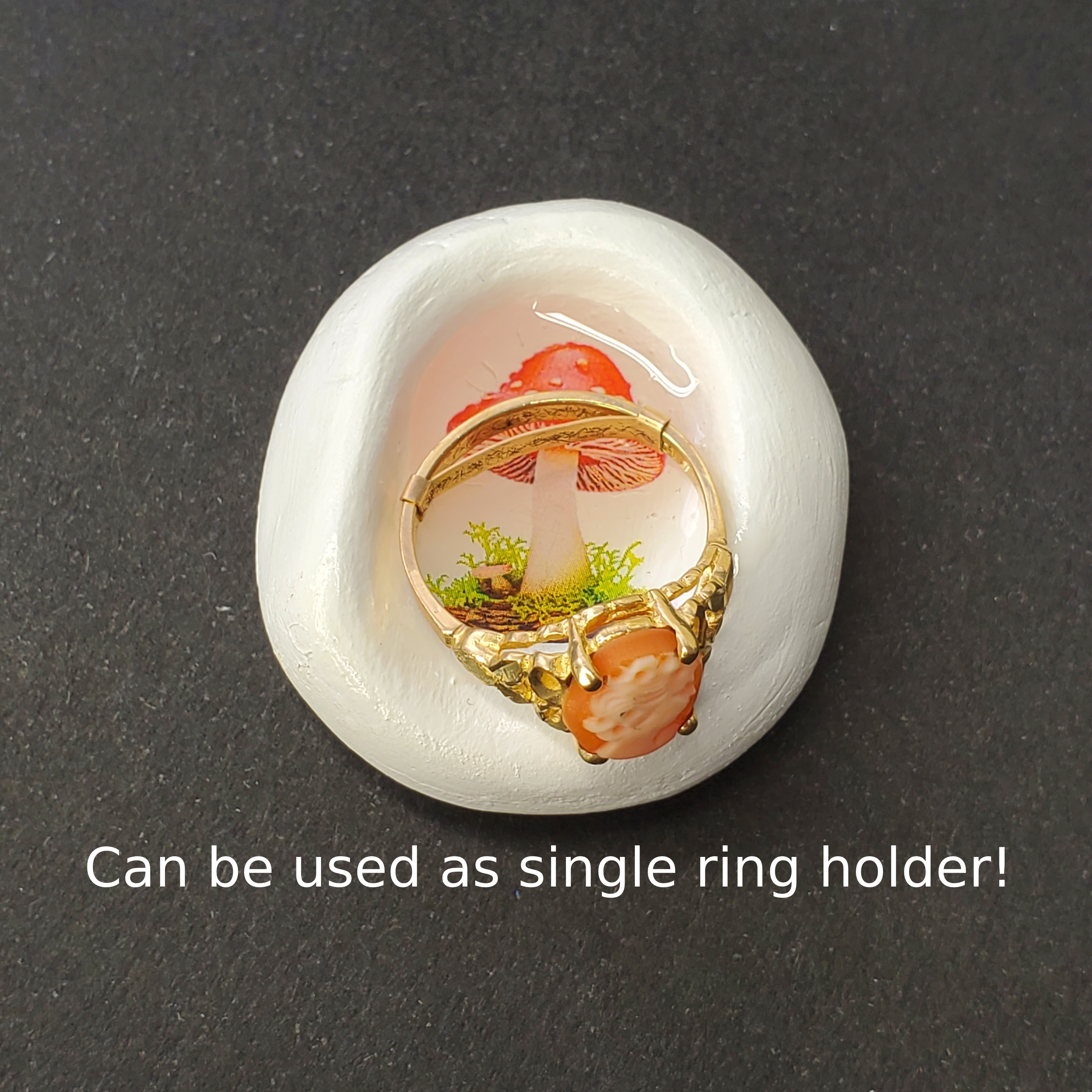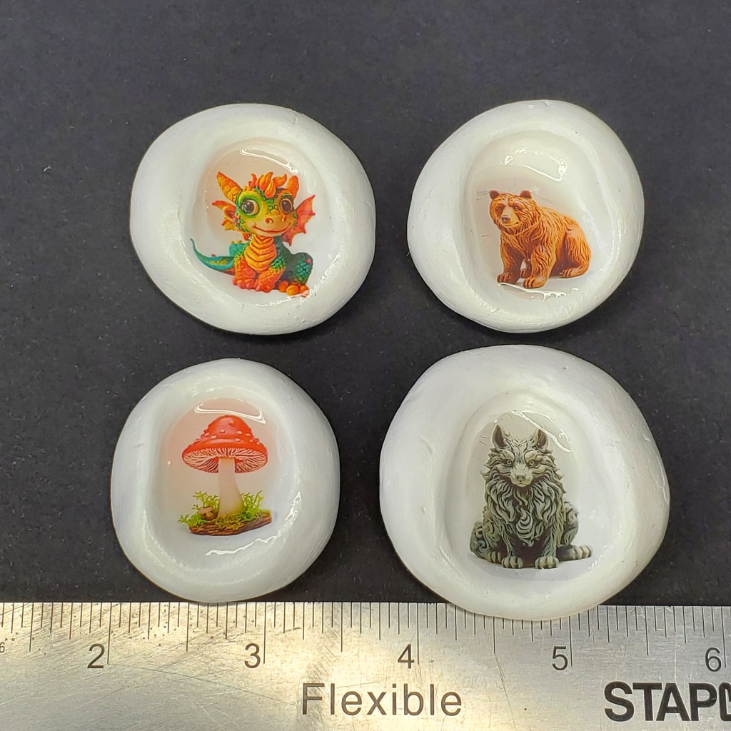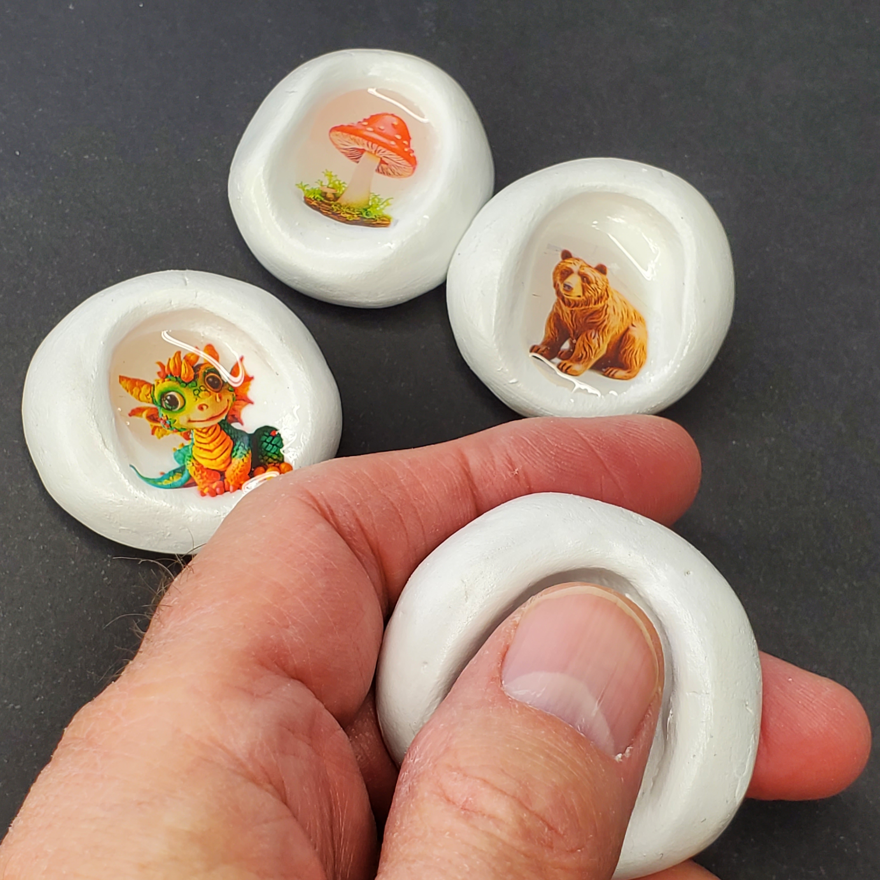 I created these worry stones recently that feature images of a bear, wolf, dragon and mushroom. Air-dry clay and with my own images inset as a decal and coated with thick resin to protect it. The outer surface is coated with urethane. I’m selling all four together since shipping cost for just one might make them too expensive. Keep one or two for yourself and gift the others! Can also be used as individual ring holders.