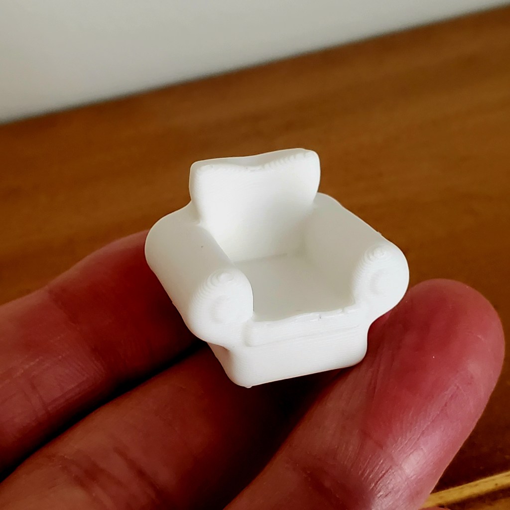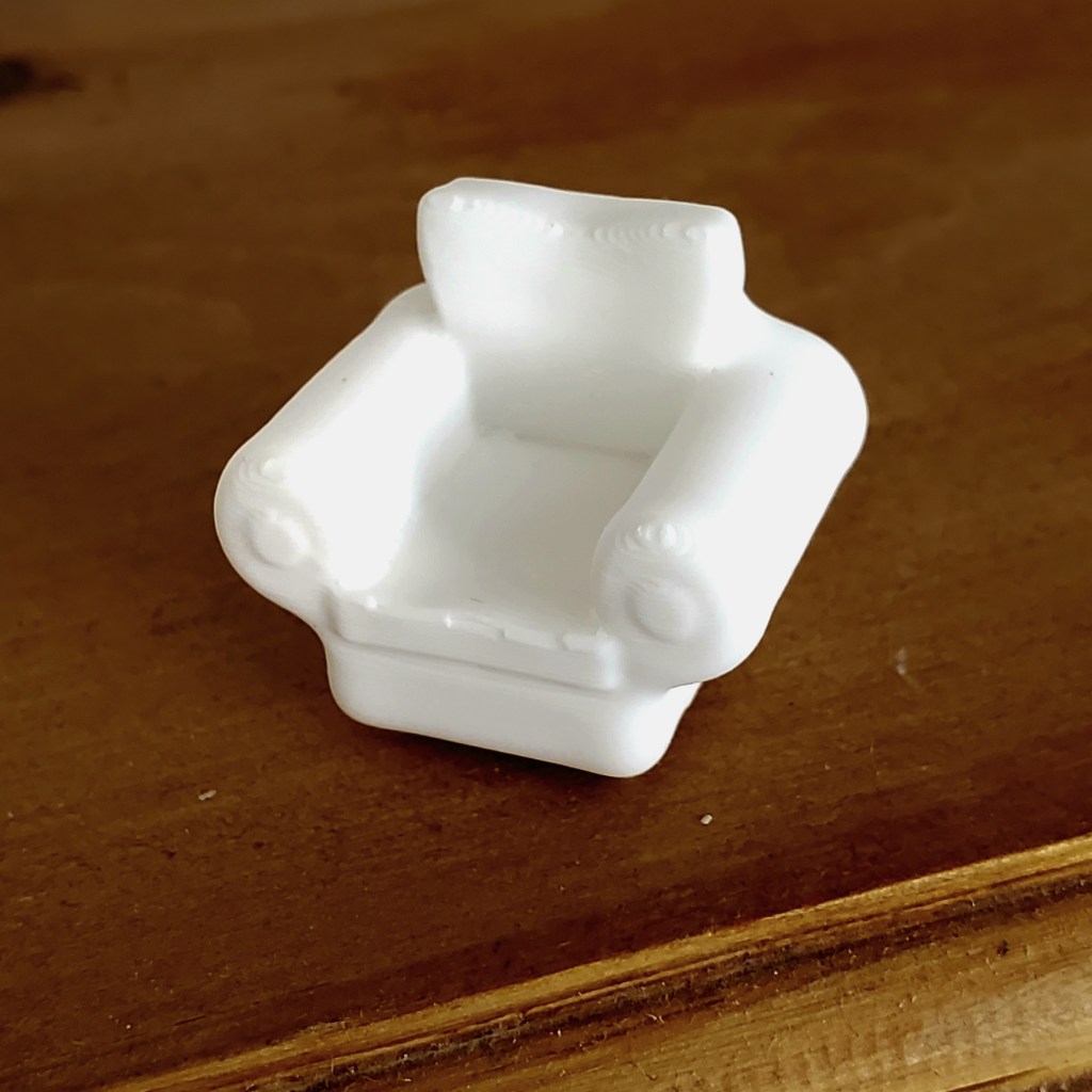 Since I bought myself a 3D printer I have been reviewing and updating some of my old 3D models. This armchair for a dollhouse was made a few years ago for the now defunct Shapeways. It actually proved to be quite expensive to print on that site, but for a home 3D printer very cheap. I gave it an aged appearance with dips in the cushion and backrest.